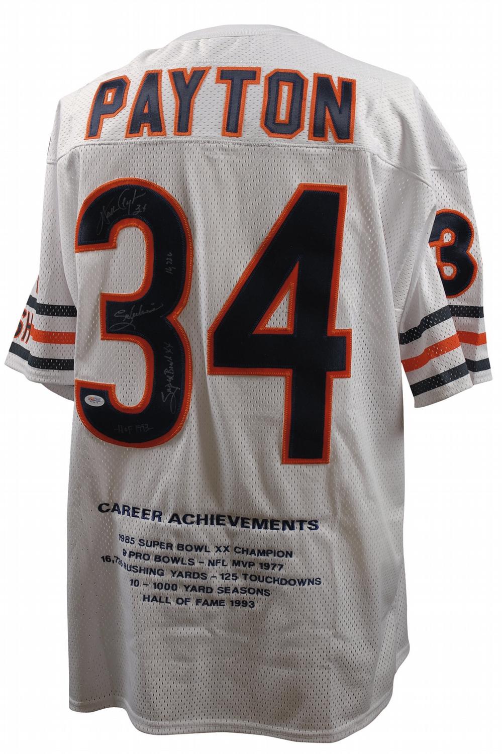 Replica Chicago Bears commemorative football jersey honoring Payton’s career achievements, with sewn on letters and numbers, signed in silver ink on the number on the back, “Walter Payton 34, 16,726, Sweetness, Super Bowl XX, HOF 1993.” In very fine condition with a PSA/DNA authentication label affixed to the number. Accompanied by a full letter of authenticity from PSA/DNA. A fact-filled jersey from the Bears icon who died in 1999.