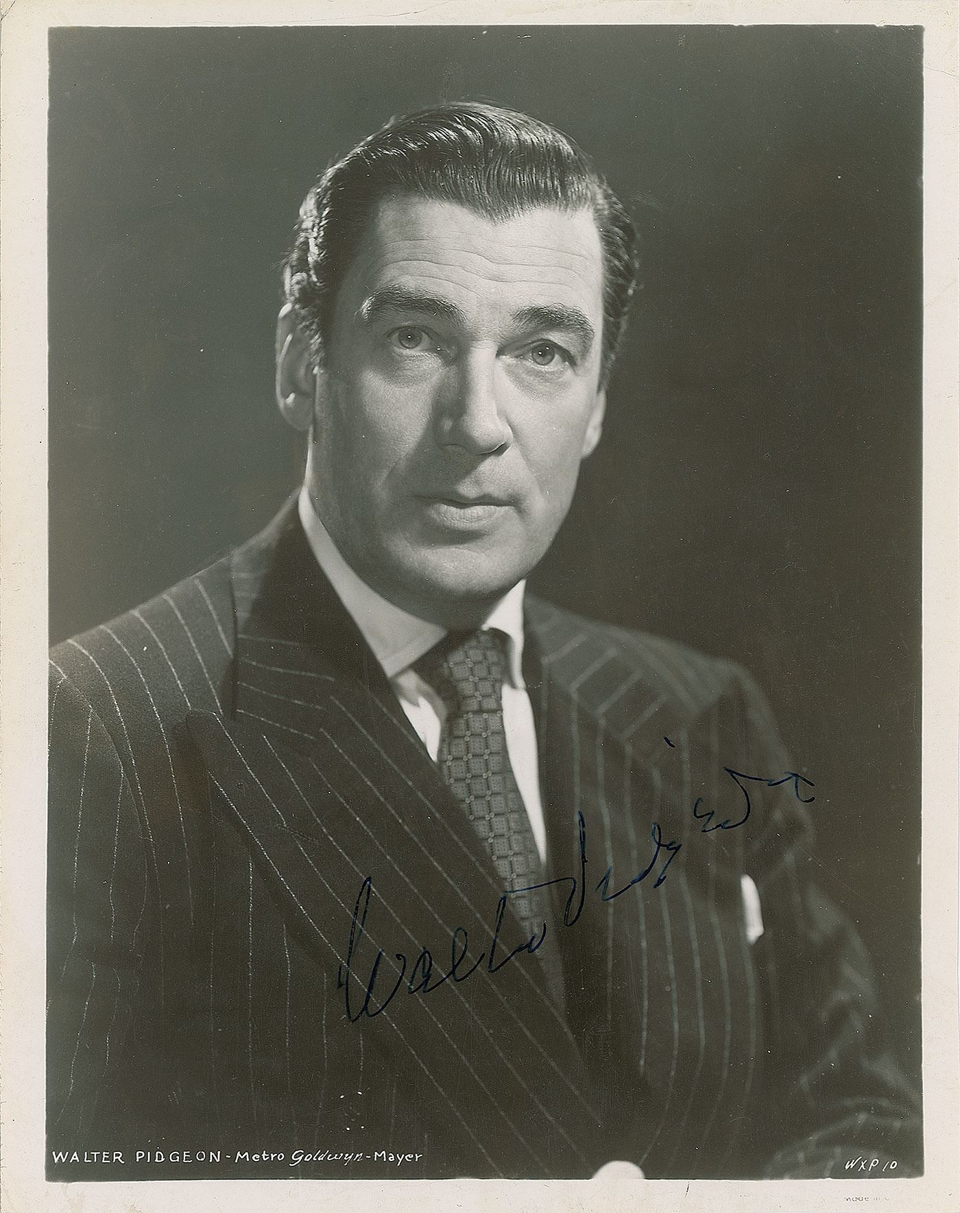 Canadian actor (1897–1984) who starred in many films, including How Green Was My Valley, Mrs. Miniver, The Bad and the Beautiful, and Forbidden Planet. Vintage glossy 8 x 10 MGM studio portrait of Pidgeon in a pinstripe suit, signed in fountain pen. In fine condition.