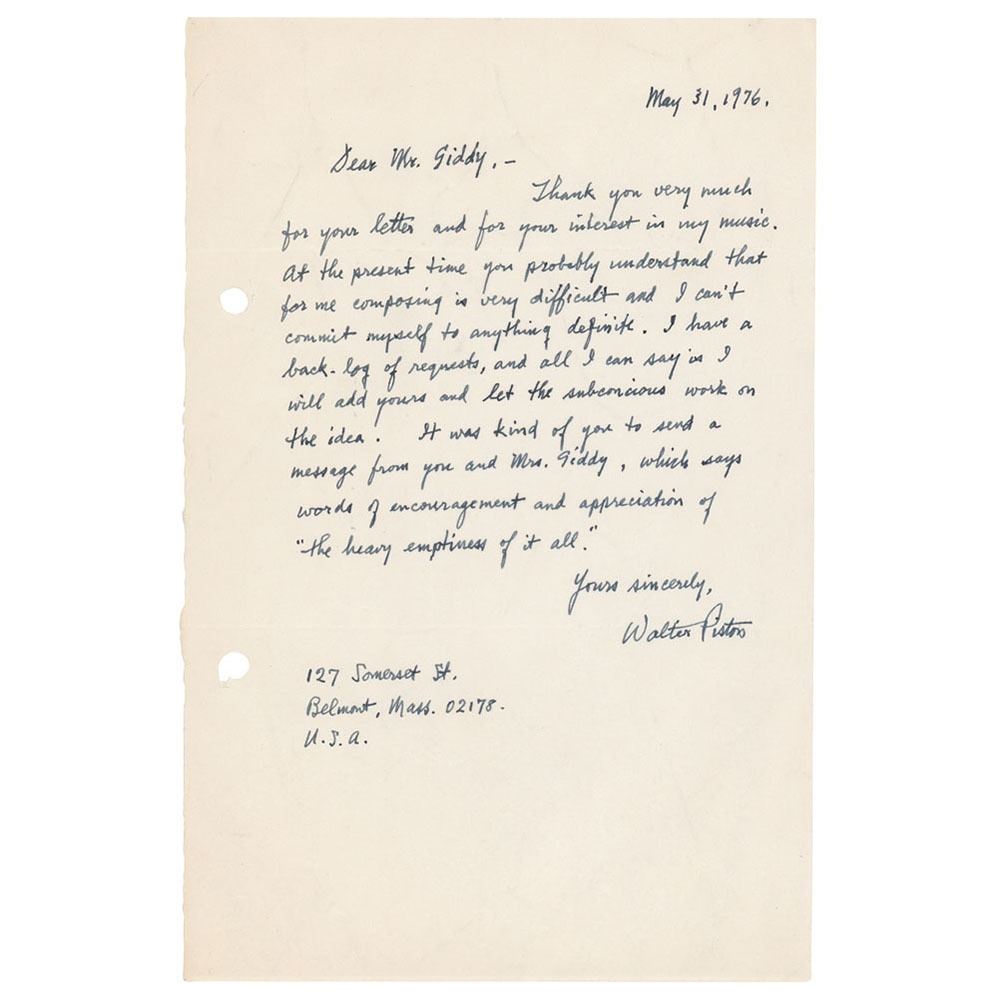 ALS, one page, 5.5 x 8.25, May 31, 1976. Handwritten letter to Mr. Giddy, in full: "Thank you very much and for your interest in my music. At the present time you probably understand that for me composing is very difficult and I can't commit myself to anything definite. I have a back-log of requests, and all I can say is I will add yours and let the subconscious work on the idea. It was kind of you to send a message from you to send a message from you and Mrs. Giddy, which says words of encouragement and appreciation of 'the heavy emptiness of it all.'" In very good to fine condition, with light creasing and two file holes.