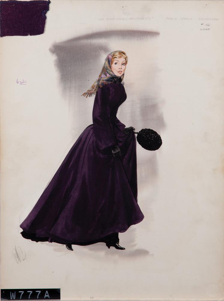 (MGM, 1958) Pencil, watercolor and gouache on 15 x 20” illustration board with fabric swatch affixed, attributed to Walter Plunkett, costume designer for this prestige MGM literary drama. Extremely detailed and richly colored in deep purple, illustration is a long winter coat with ball-shaped muff for Maria Schell, who portrayed “Grushenka”. Contains initials on recto of producer Pandro S. Berman, and signed OK’s on verso by art director William Horning and color consultant Charles Hagedon. Minor handling soiling around margins, overall Fine.