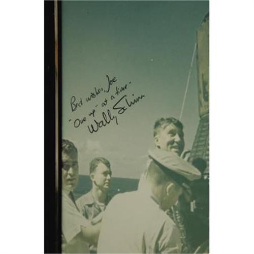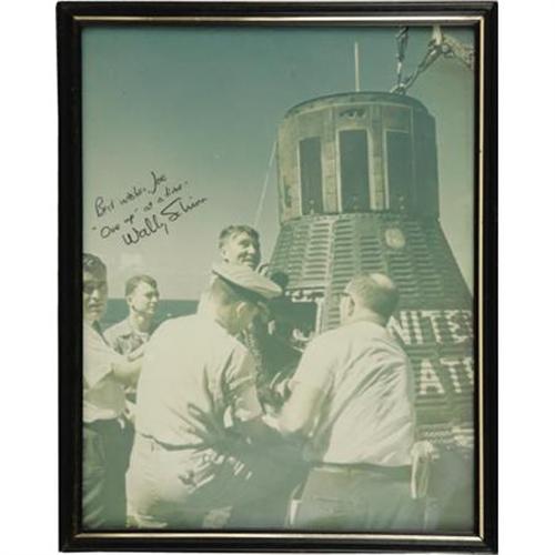 <B>Walter Schirra Large Signed Color Photograph,</B></I> 10" x 13", framed to 11" x 14". Signed "<I>Best wishes, Joe/ 'One up' at a time -/ Wally Schirra.</B></I>" The photo has faded a bit. Schirra has just removed his helmet in this October 3, 1962, photo. He is being helped out of his <I>Sigma 7</B></I> Mercury capsule by Navy personnel after completing six orbits of the Earth. <I>From the collection of renowned former physical trainer of the astronauts Joe Garino. This lot is accompanied by a signed certificate of authentication from Garino verifying its provenance.</B></I><BR><BR><b>Shipping:</b> Framed - with Glass, Small (<a target="_blank" href="http://www.heritageauctions.com/common/shipping.php">view shipping information</a>)