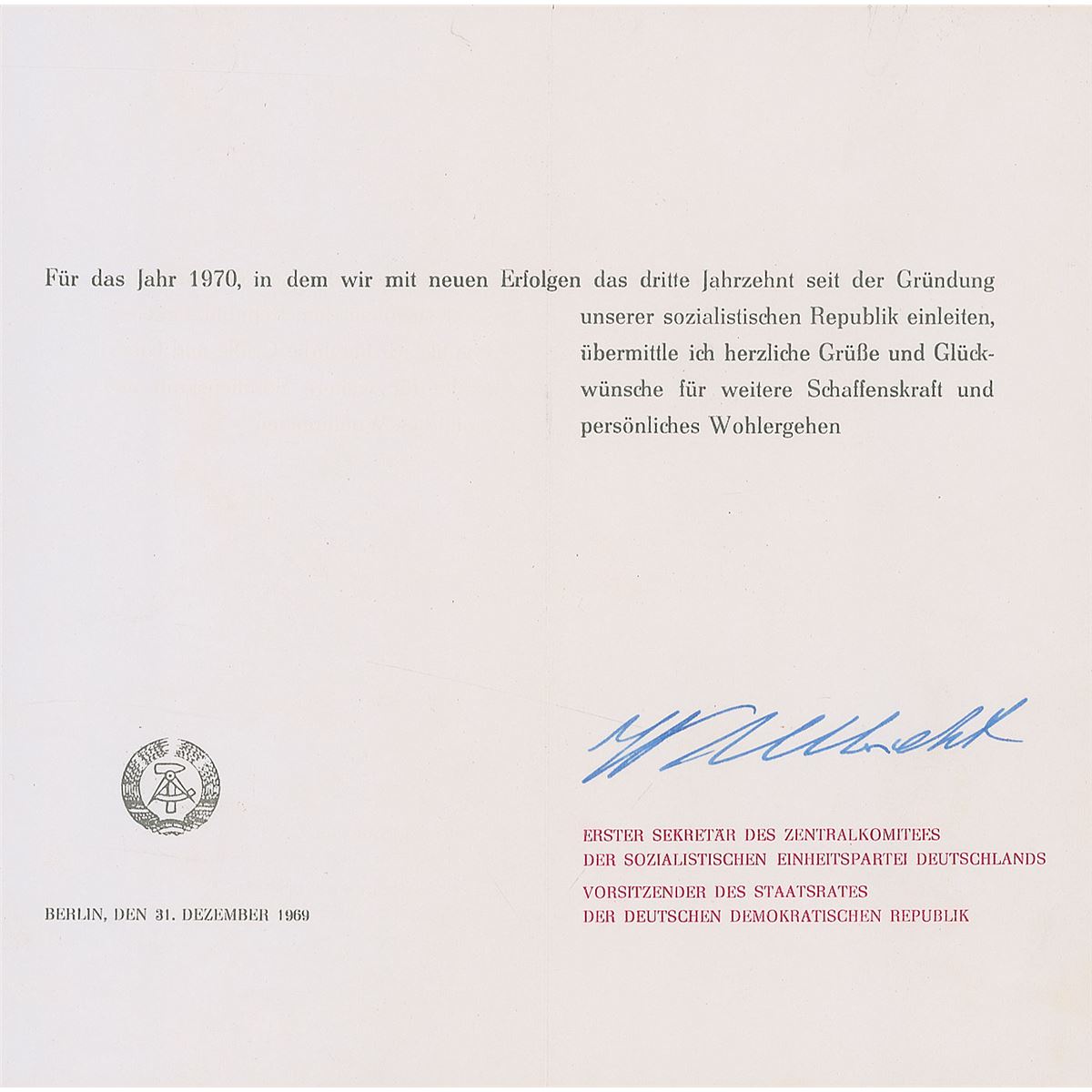 German communist politician (1893–1973) who led East Germany from 1960 until his death. New Year’s card sent to celebrate the beginning of 1970, measuring 8 x 8 open, featuring a printed message in German inside, signed below in fountain pen, “W. Ulbricht.” In fine condition.