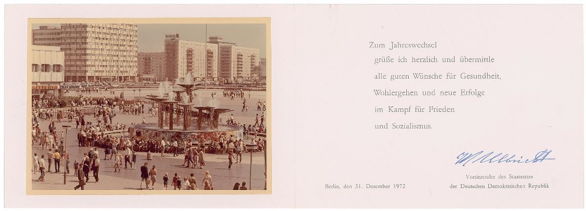 German communist politician (1893–1973) who led East Germany from 1960 until his death. New Year’s card sent to celebrate the beginning of 1973, measuring 8.25 x 5.75 closed, featuring an affixed photo and printed message in German inside, signed below in blue fountain pen, “W. Ulbricht.” In fine condition.