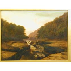 A LADY BESIDE A WATERFALL IN A WOODED VALLEY