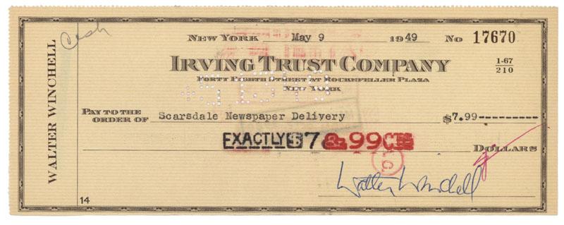 A check drawn on the Irving Trust Company and signed by Walter Winchell as maker.