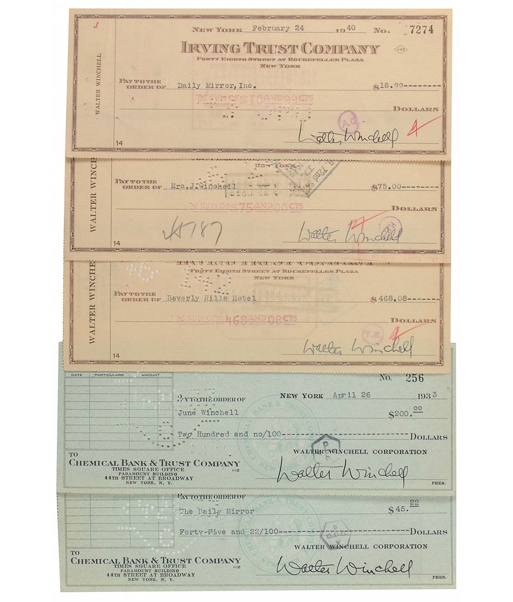 Five bank and business checks, each approximately 8.25 x 3.25, filled out in type and signed by Winchell, dated between 1933 and 1942. In overall fine condition, with expected bank stamps, notations, and cancellation holes (some stamps and notations slightly affecting signatures).