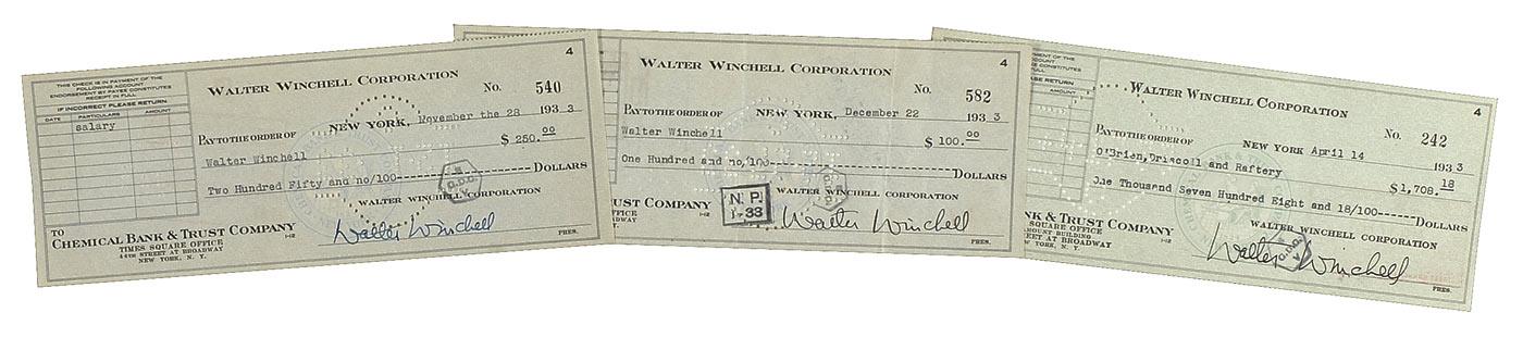 Broadcaster who was a familiar voice on radio, from 1929 through the mid-1950s, with his staccato delivery punctuated by the sound of teletype keys. Three business checks from 1933, each 8.5 x 3.25, filled out in type and signed in fountain pen, “Walter Winchell.” Two of the checks have been made payable to Winchell (individually for salary and expenses) and endorsed by him on the reverse. In fine condition, with cancellation stamps and holes lightly touching all three signatures, and one with a fold passing through the signature. RRAuction COA.