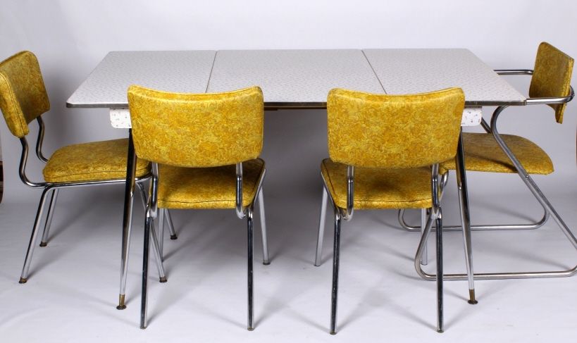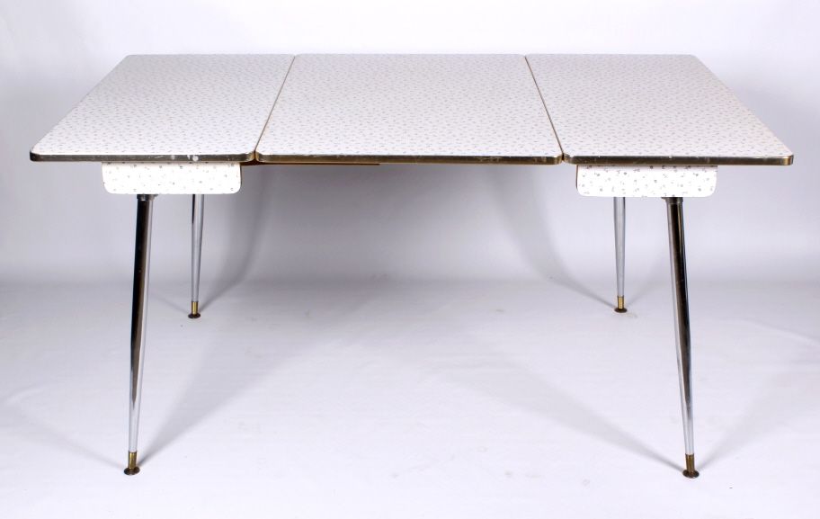 This lot features a Chrome leg and retro top unique drop leaf table and 4 Chrome leg and floral vinyl pattern chairs. This is a great set in excellent condition. The chairs are flawless and the fabric pops. The table features a drop leaf style when compacted, but has a unique style of opening having the legs slide on rails pushing the leaves up making it a full size table. The table is 35.5" deep, 23.5" drop leaf and 58.75" open leaf and sits 29" tall.