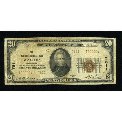 <B>Walters, OK</B></I> - $20 1929 Ty. 2 <B>The Walters NB</B></I> Ch. # 7811<BR> This Serial Number 4 issue received some even wear which fails to break the continuity of the paper save for a margin nick at bottom. This piece was last offered to Oklahoma specialists in 2001 when it realized over $600. <B>Very Good-Fine.</B></I><BR><I>From The Rolling Plains Collection</B></I><BR><BR><b>Shipping:</b> Coins & Currency (<a target="_blank" href="http://www.heritageauctions.com/common/shipping.php">view shipping information</a>)