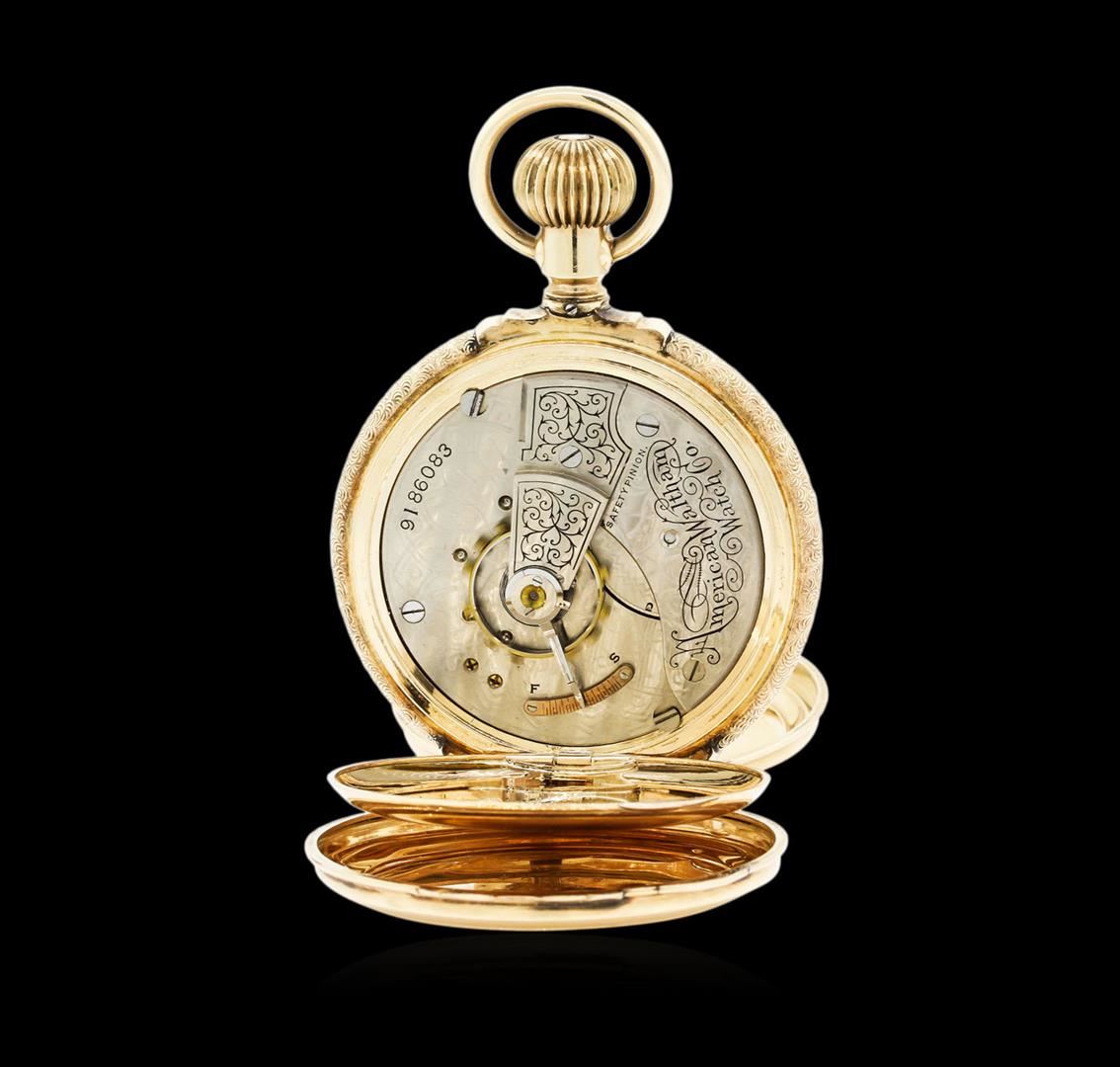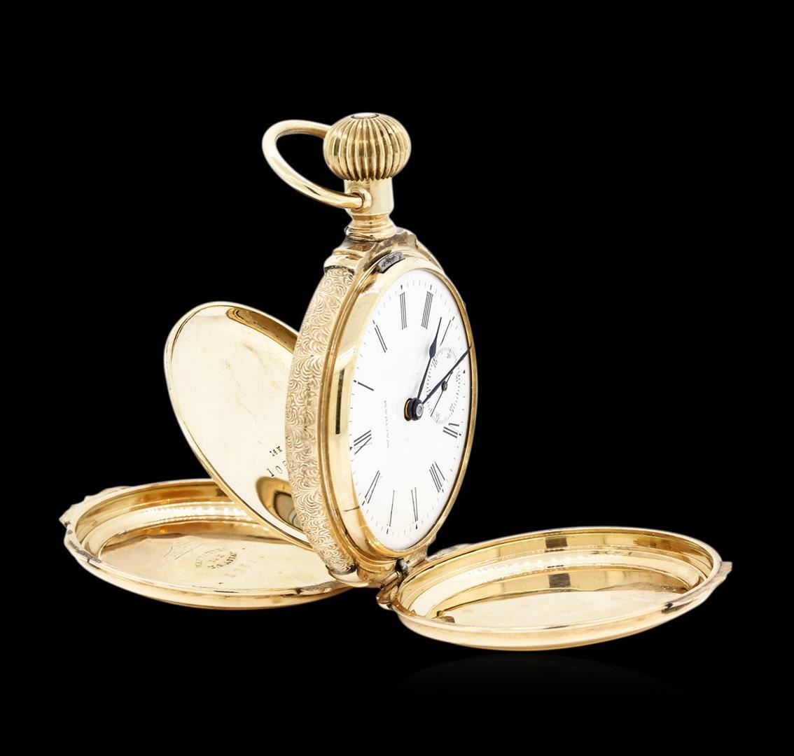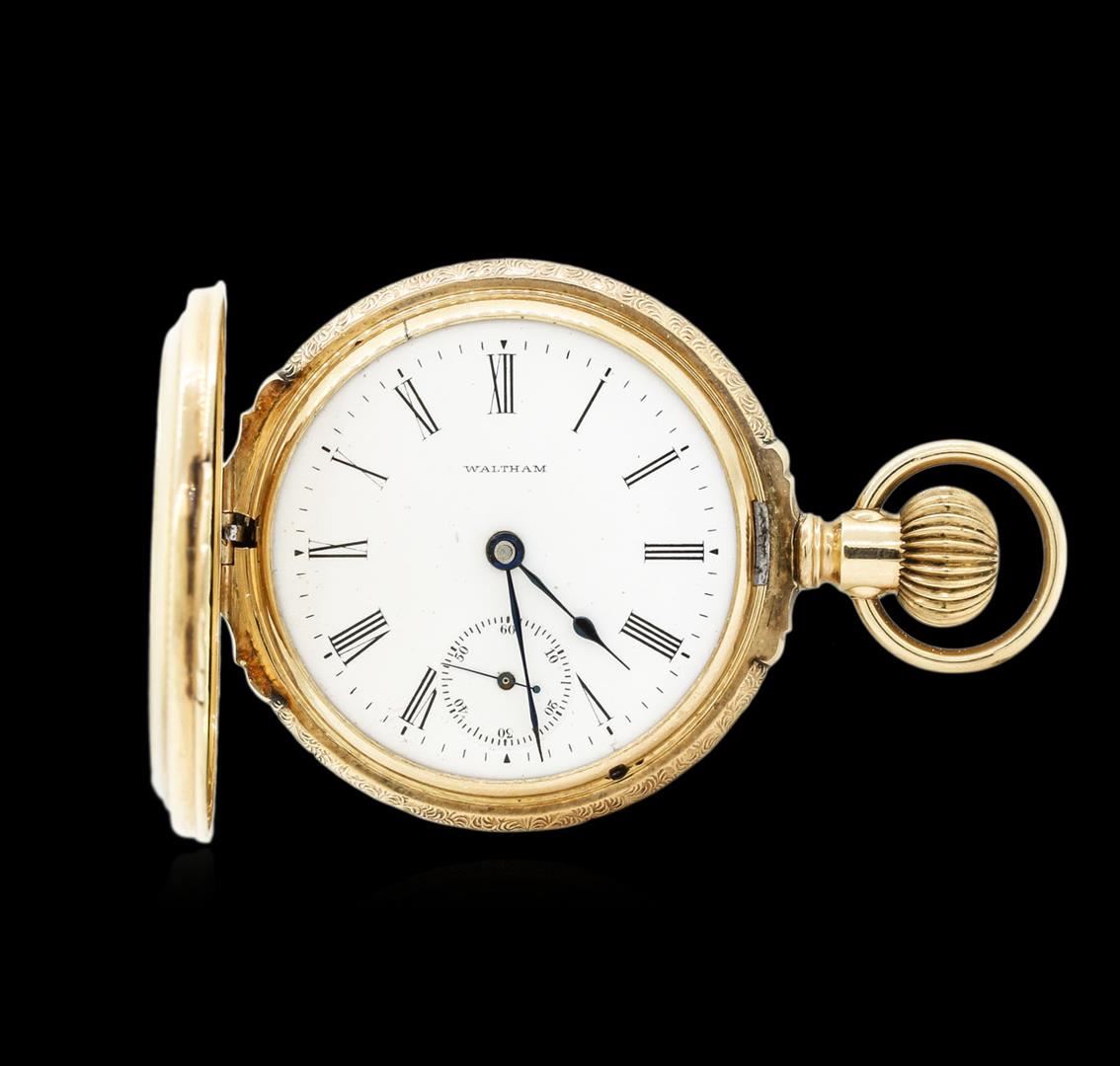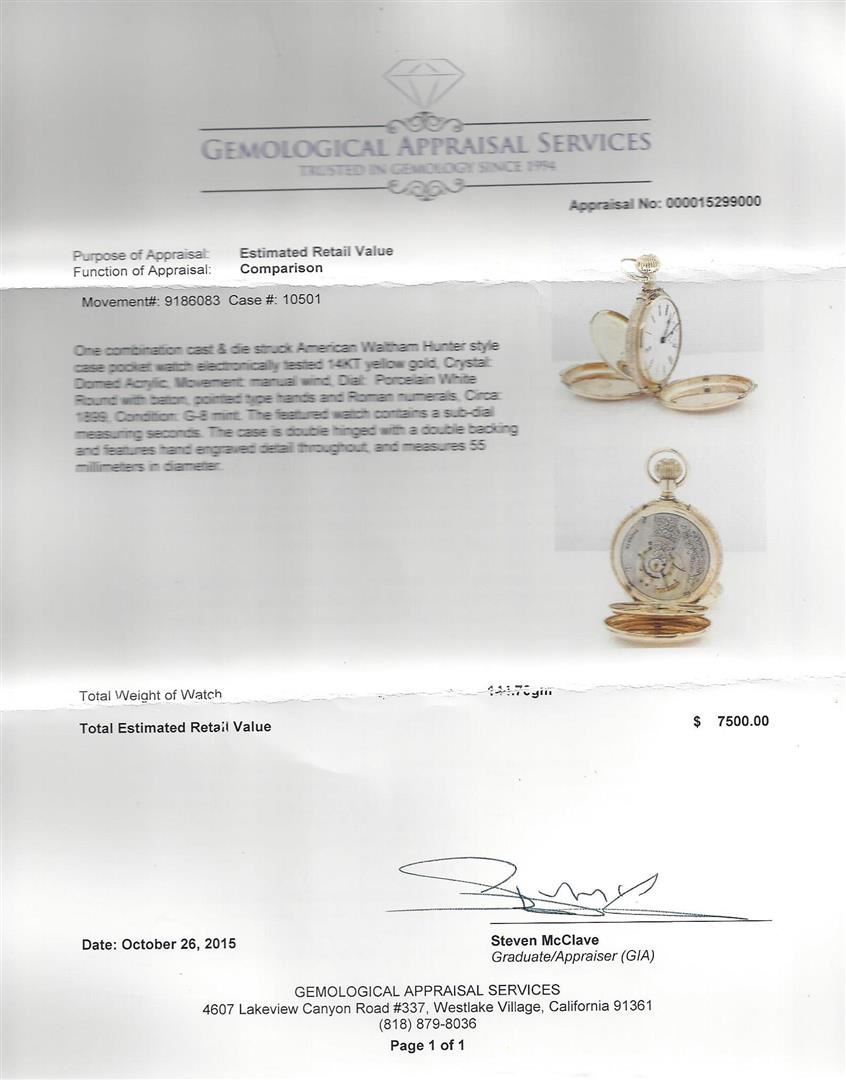 One, combination cast & die struck American Waltham Hunter style case pocket watch electronically tested 14KT yellow gold, Crystal: Domed Acrylic, Movement: manual wind, Dial: Porcelain White Round with baton, pointed type hands and Roman numerals, Circa: 1899, Condition: G-8 mint. The featured watch contains a sub-dial measuring seconds. The case is double hinged with a double backing and features hand engraved detail throughout, and measures 55 millimeters in diameter. Total Weight of Watch 144.70gm. GAS Appraised at $7,500.00.