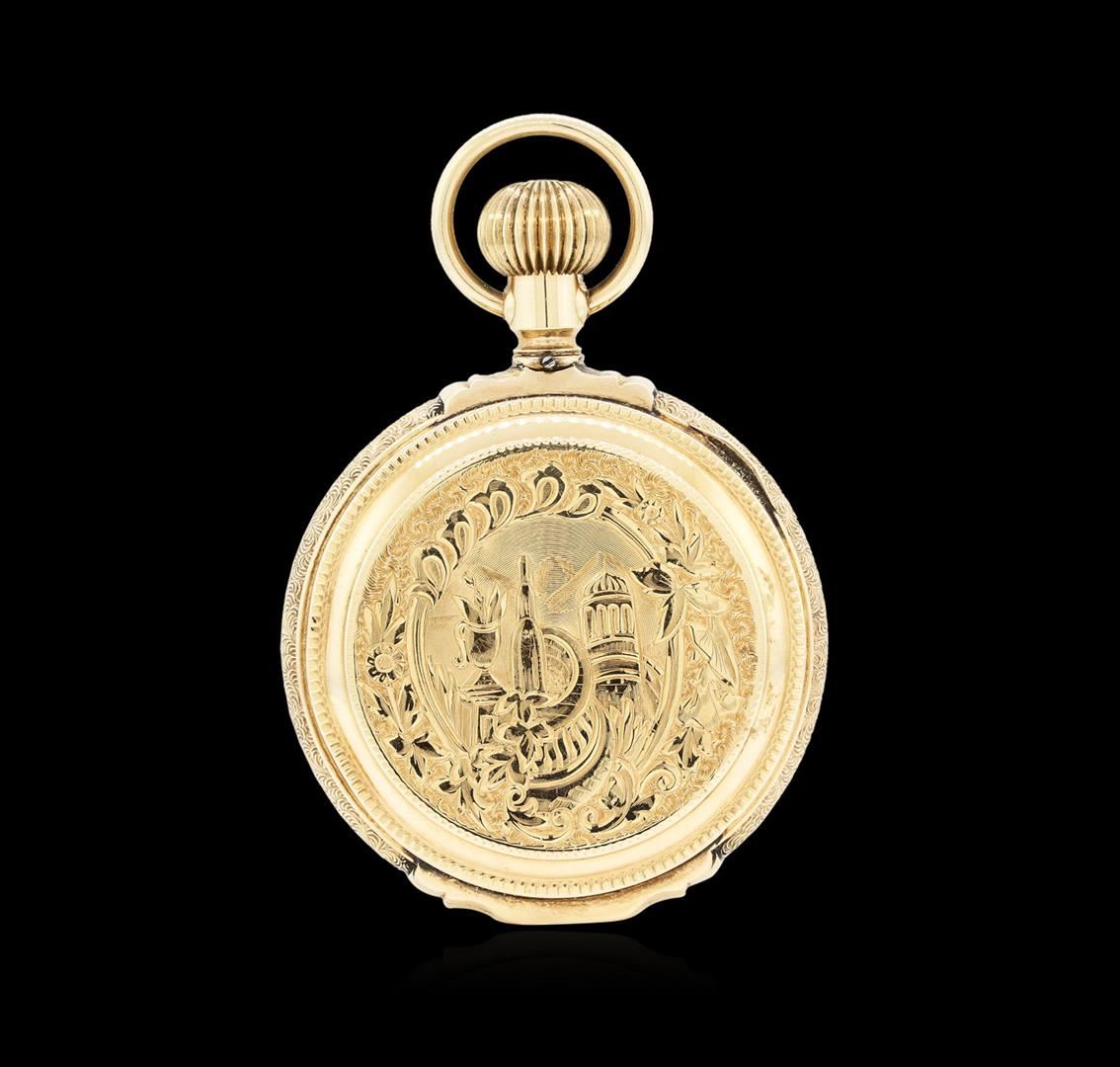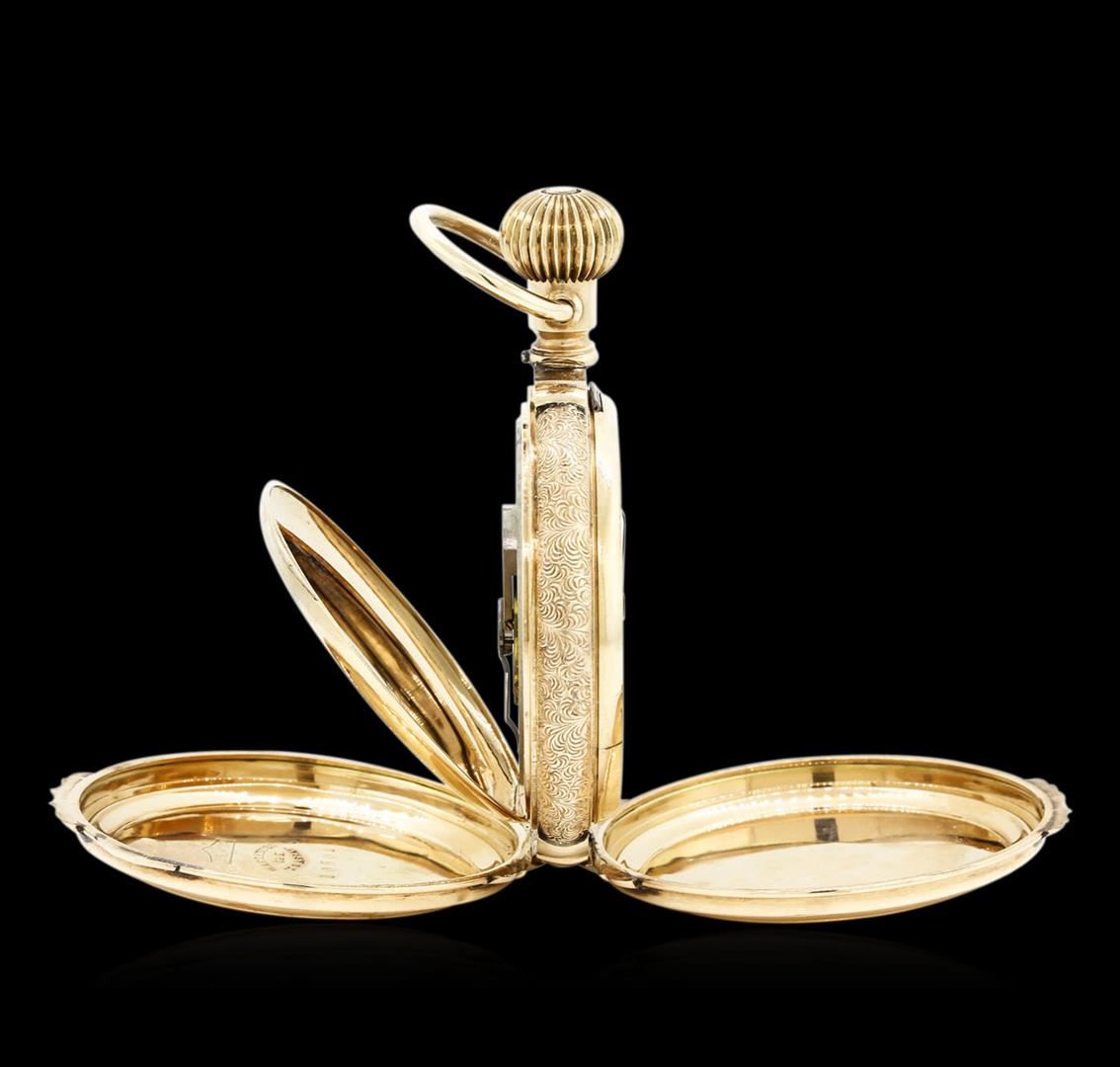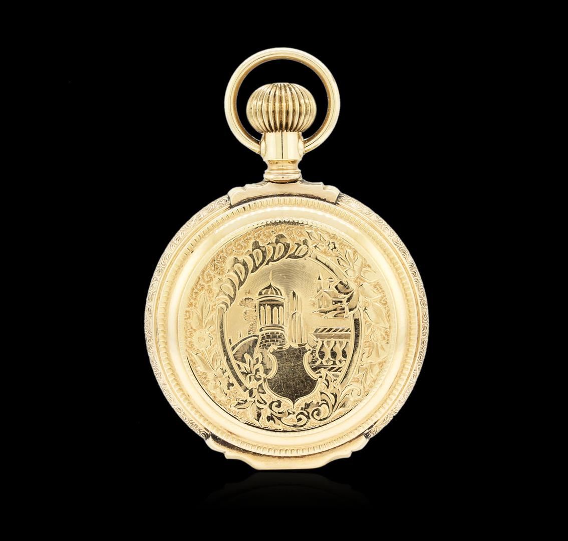 One, combination cast & die struck American Waltham Hunter style case pocket watch electronically tested 14KT yellow gold, Crystal: Domed Acrylic, Movement: manual wind, Dial: Porcelain White Round with baton, pointed type hands and Roman numerals, Circa: 1899, Condition: G-8 mint. The featured watch contains a sub-dial measuring seconds. The case is double hinged with a double backing and features hand engraved detail throughout, and measures 55 millimeters in diameter. Total Weight of Watch 144.70gm. GAS Appraised at $7,500.00.