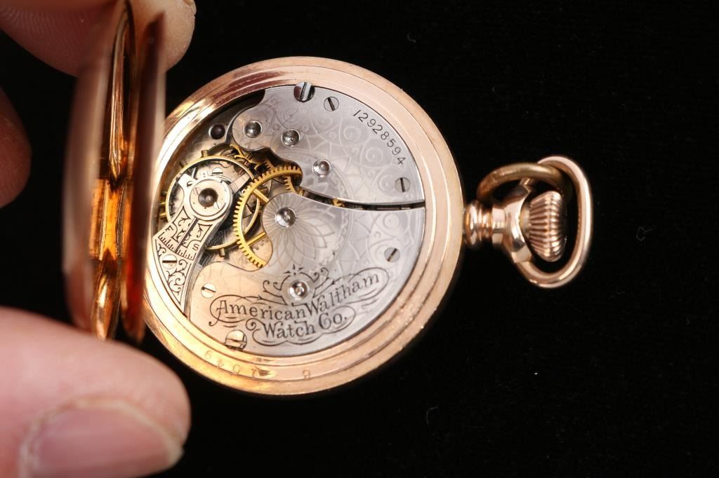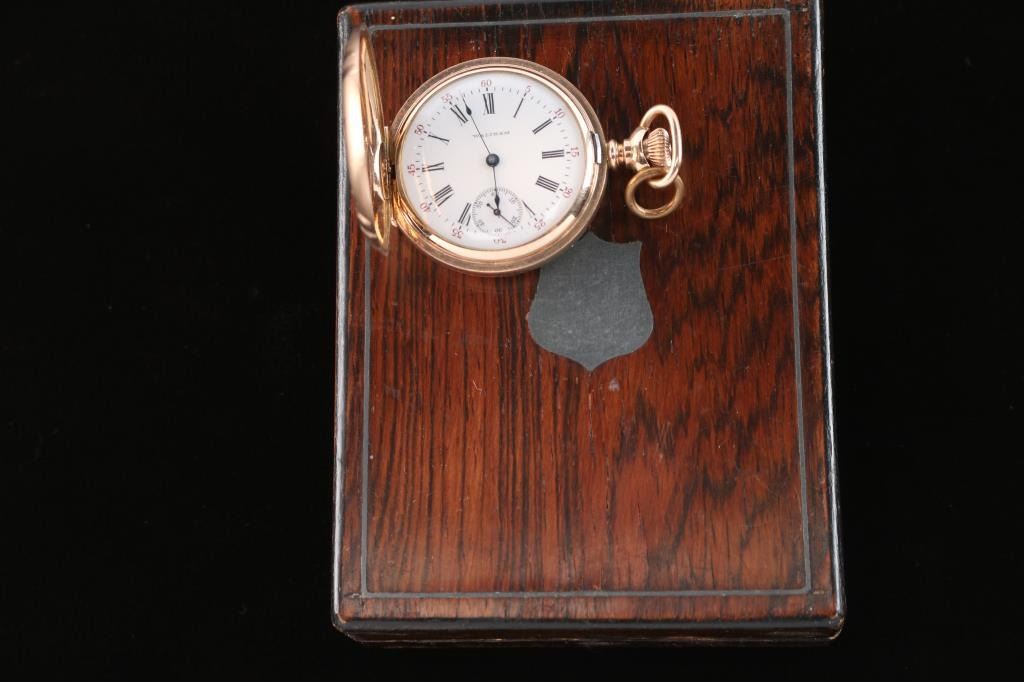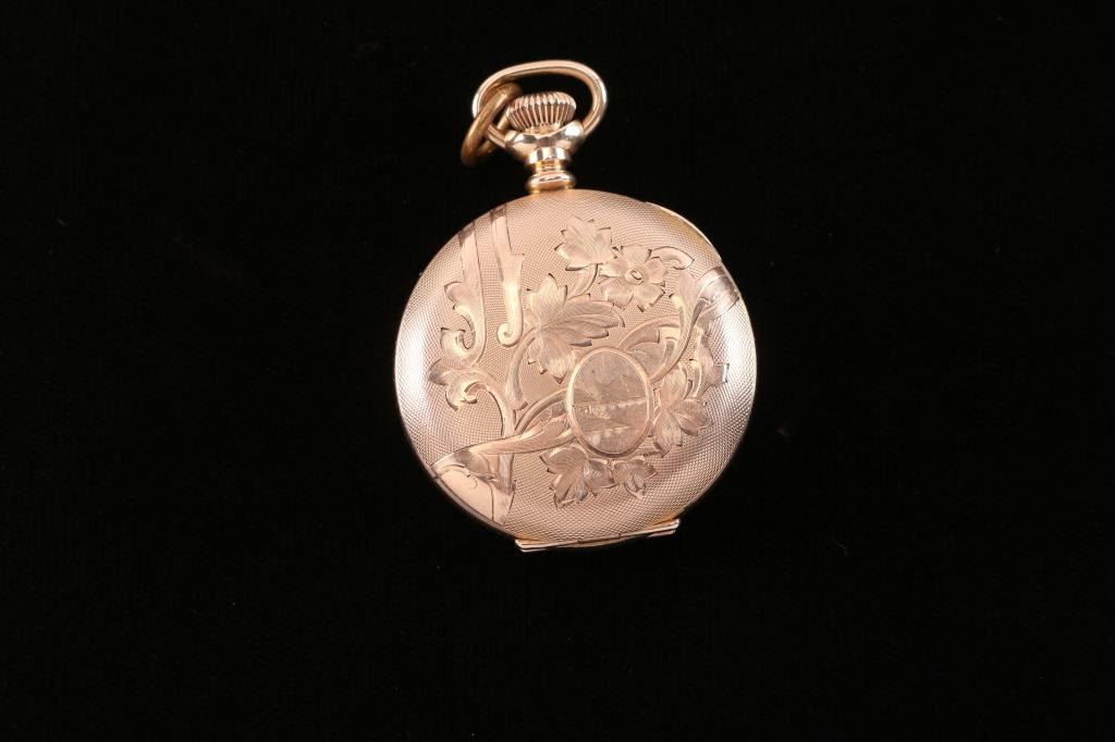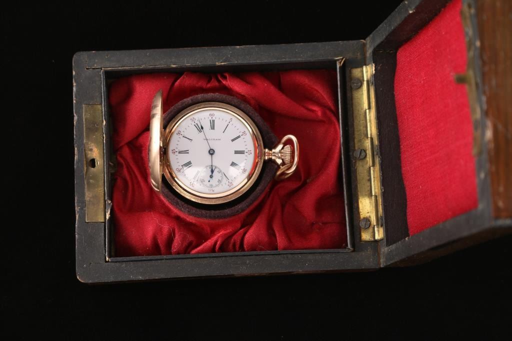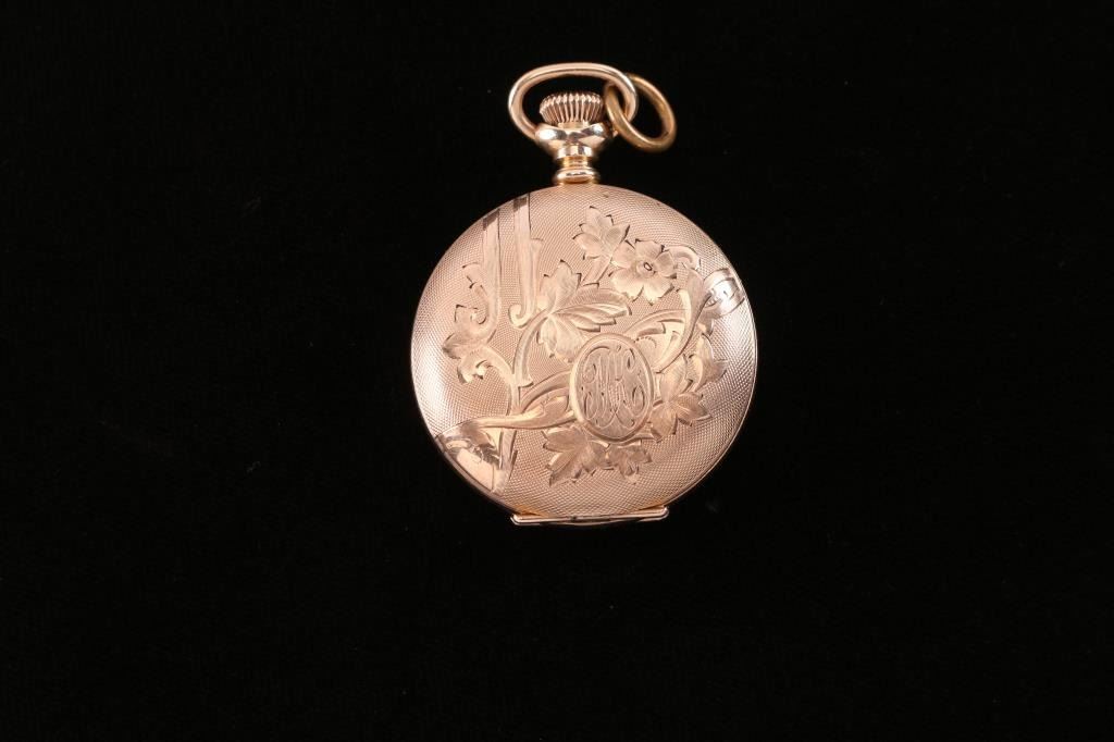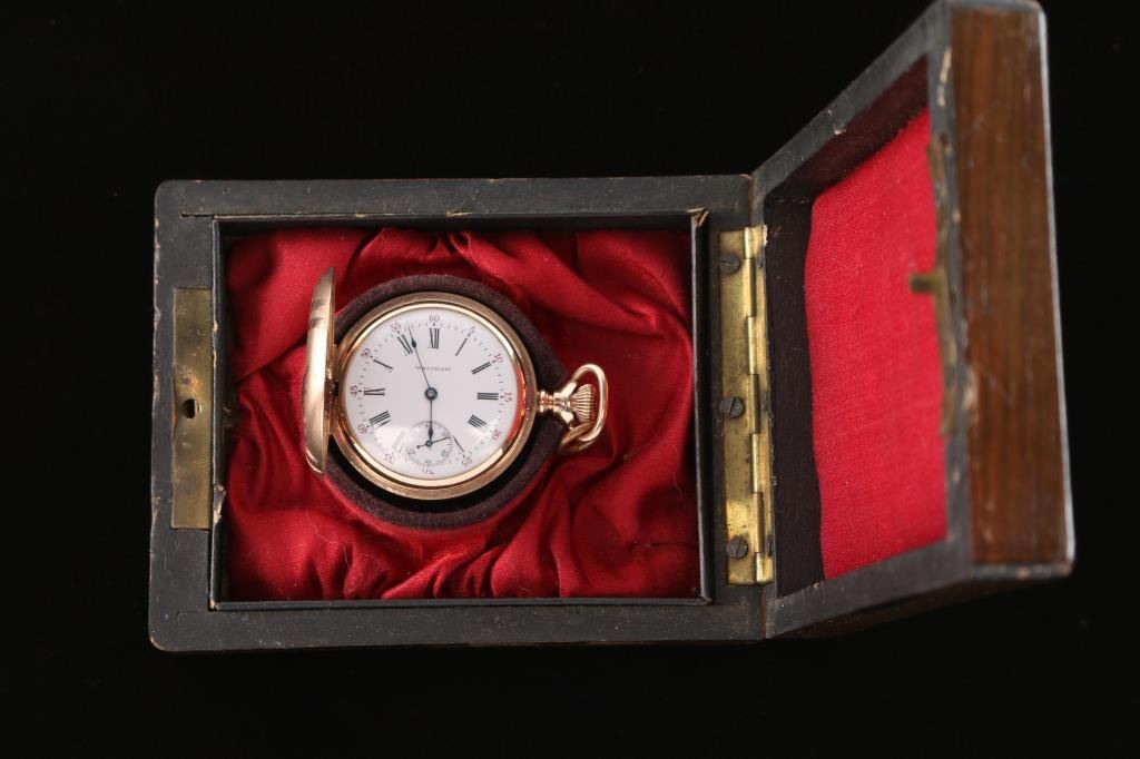 Seaside Grade, #12928594. Dueber 20 year case. In dealer type box. Nice clean movement, recently serviced and cleaned. Running condition. Initials M. K. engraved on case front within floral engraved motif.