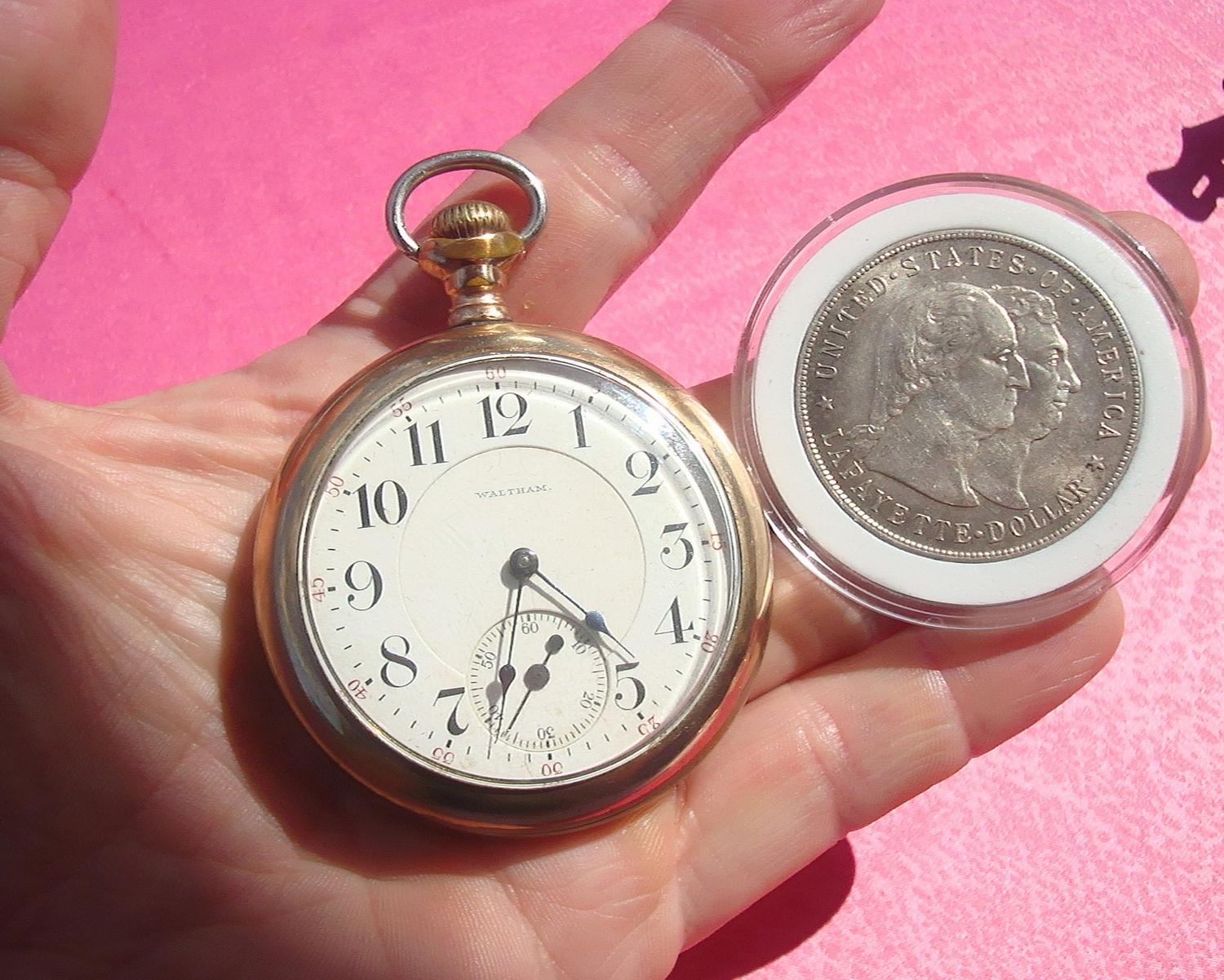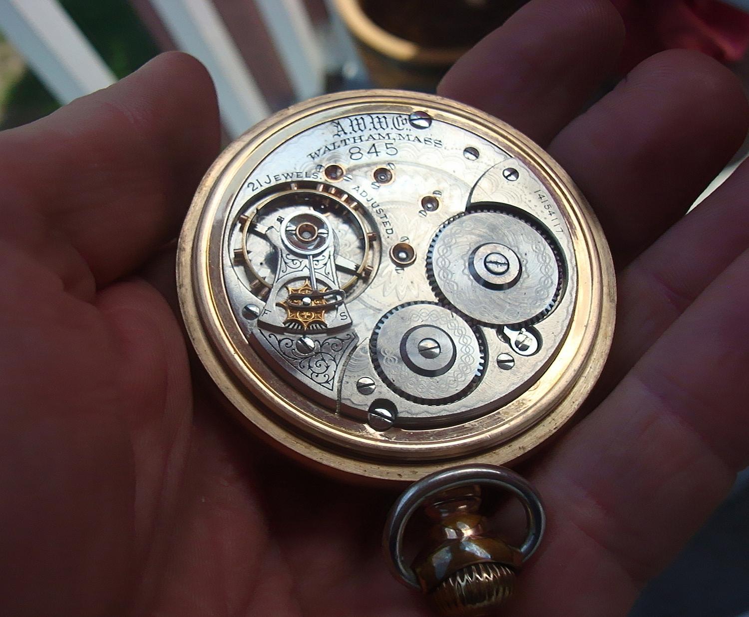 A fine and handsome Waltham Railroad Grade Size 18 Mens Pocket Watch with engraved Locomotive on cover. Twenty-One Jewels model/year 1892 with a Grade of 845.