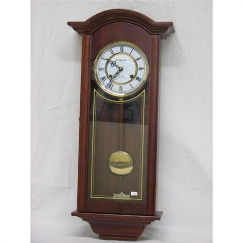 Waltham 32 Day Chime Mahogany Case Wall Clock, key included. 29 1/2 H, 13 W, 4 1/2 D. Condition: no damage noted.