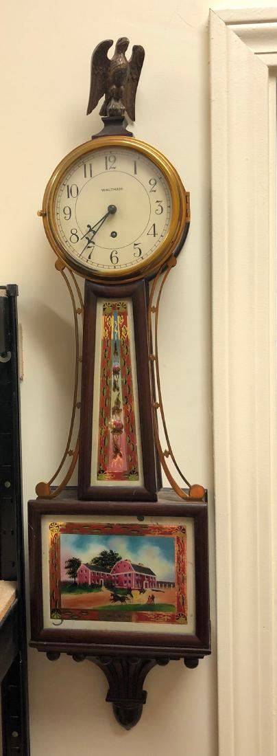 Key Wind Waltham Banjo clock, spring driven mahogany with beautiful Wayside Inn on glass, all in beautiful condition.
