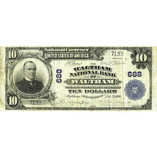 <B>Waltham, MA</B></I> - $10 1902 Plain Back Fr. 624 <B>The Waltham NB</B></I> Ch. # 688<BR>A new piece to the census from this Boston area bank. <B>Fine.</B></I>