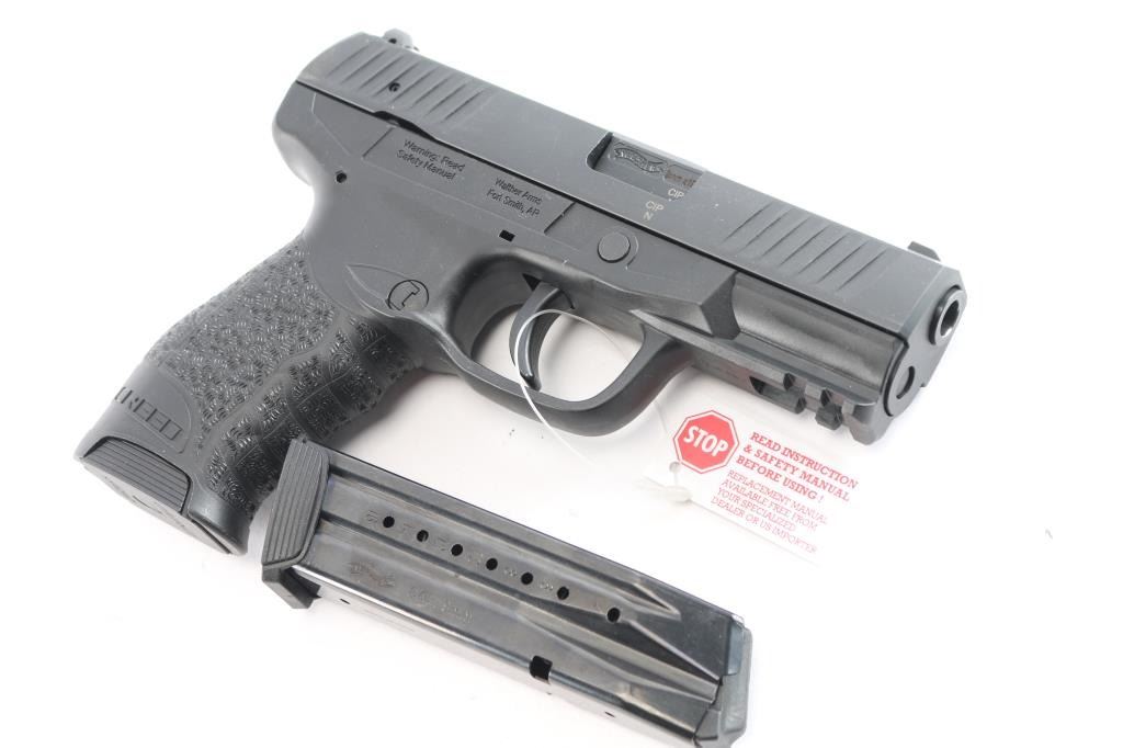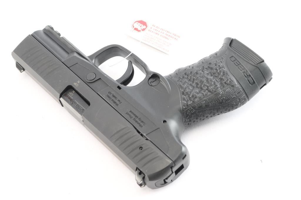 German made semi-automatic double-action only hammer fired pistol chambered for 9x19mm. Manufactured in 2018 in Ulm, Germany. The Creed offers a black reinforced polymer frame, fixed blade front sight with white dot, dovetailed square notched rear sight with two white dots, front and rear slide serrations, serrated slide stop, serrated take-down lever, smooth curved steel trigger, undercut trigger guard, pre-cocked double-action trigger system, full-length plastic guide rod with a flat recoil spring, checkered ambidextrous magazine release, MIL-STD-1913 picatinney accessory rail on the dust cover, 360 degree non-slip grip texturing with shallow finger grooves, and a and a bobbed hammer. All metal components are treated with a corrosion and abrasion resistant 'Tenifer' coating, providing a matte black hardened surface. The original Tenifer finish retained is approximately 99% with nothing remarkable. Metal displays no rust or deformation. The action is smooth and crisp, and the polymer frame is also in excellent condition. The bore is bright with strong rifling. Pistol includes the original black foam lined factory hard case, owner's manual, lock, and two fifteen-round magazines total.