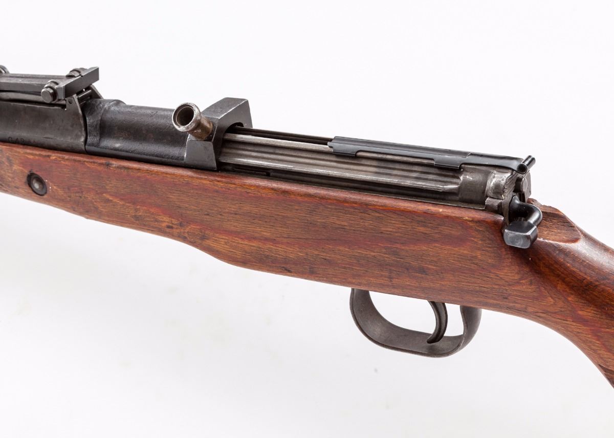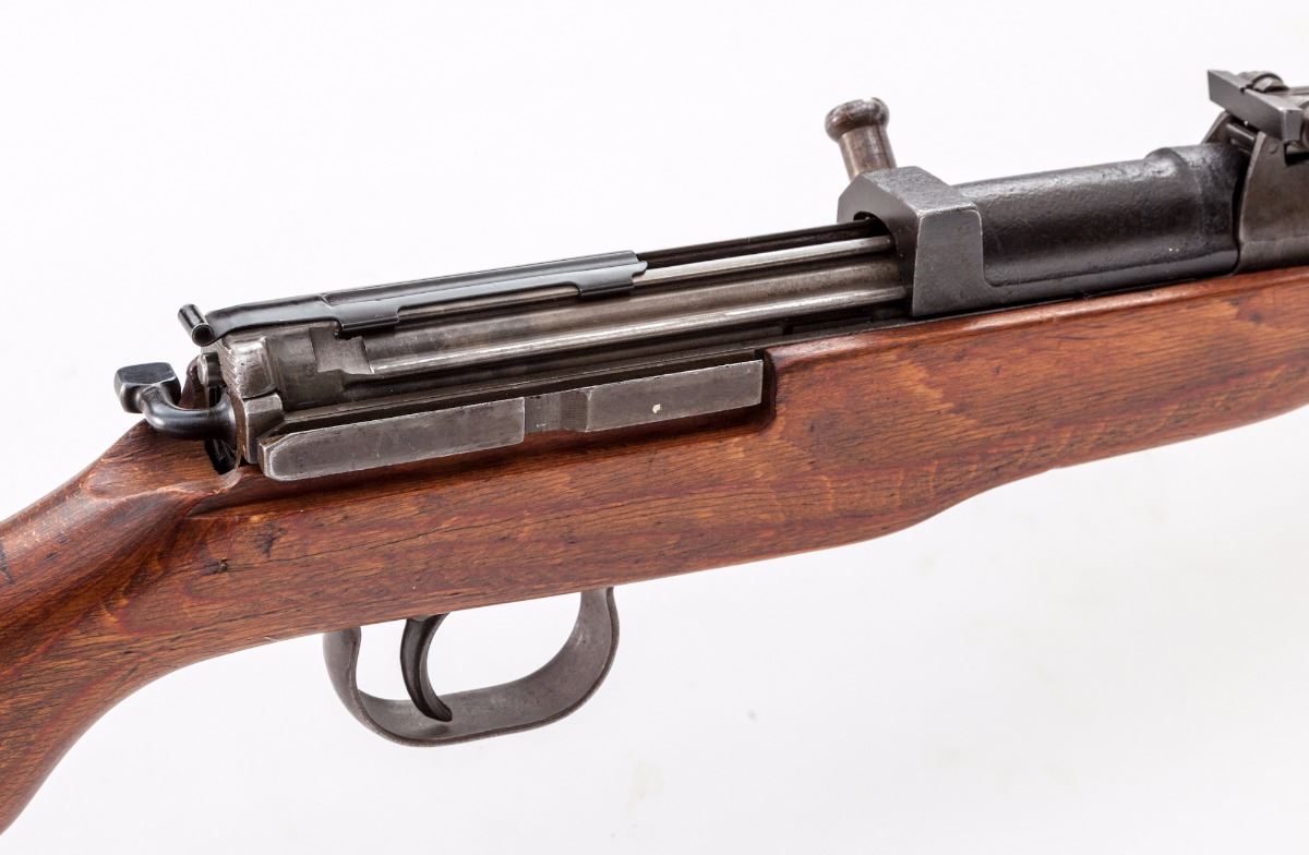 Walther G43 Semi-Automatic Rifle (ac/44), #84081, 8mm, 22'' barrel, phosphate finish, laminated beechwood stock, no magazine. Condition is very good retaining approx. 85% thinning finish. Dustcover is present. Mfg'd without bolt hold-open switch. Unnumbered small parts. Stock with chip out of laminated portion at pistol grip left side, and loss to forward top portion of upper handguard. Action is crisp, bore is bright, cleaning rod is present. Est.: $1,200-$1,800. (C&R)