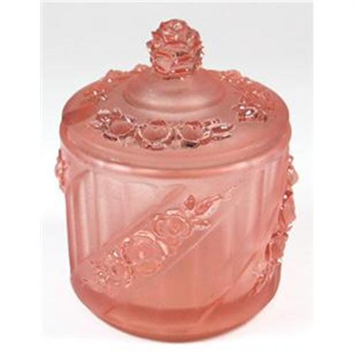 Produced by Walther Glass, in their ROSEN pattern circa 1930. This pink satin and clear glass Art Deco jam jar or relish pot features a rose bud finial with a surround of roses and leaves adorning the lid. The jar is adorned with matching banners of embossed roses and leaves This exquisite, very high quality, Art Deco pink satin and clear glass condiment jar measures 3 inches in diameter x 4 inches tall. With only two small nicks under the rim of the lid, due to age and use, otherwise both the jar and lid in excellent condition