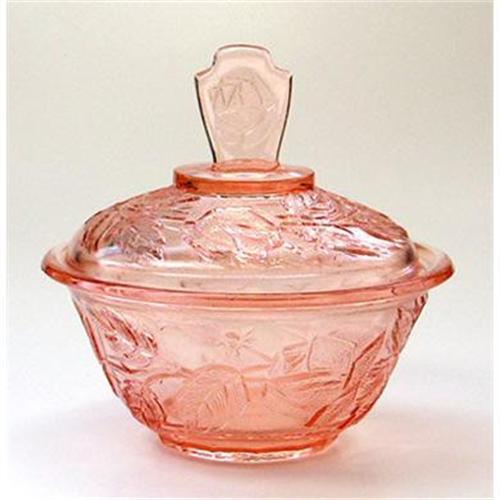 Originally from the vanity set known as Waltraut this pink Depression glass Art Deco vanity or dresser jar was produced by August Walther & Sohne during the 1930s. The jar features an intricate pattern of vines and leaves, measures about 3 x 3 3/4 inches tall and is in excellent condition.