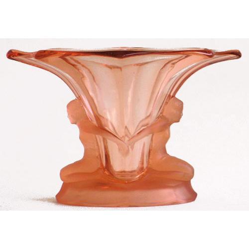 Produced by Auguste Walther & Sohne, circa 1925, and known as 'Windsor'. This spectacular salmon pink Art Deco vase features two gorgeous pink satin glass Flappers sitting back to back with the base of the vase between them, and with their arms extended backward, as if supporting it. The vase stands 8 1/2" tall and is 10 3/4" x 7" across the rim and 7" x 4" across the base. This superb salmon pink Art Deco vase is in excellent condition.