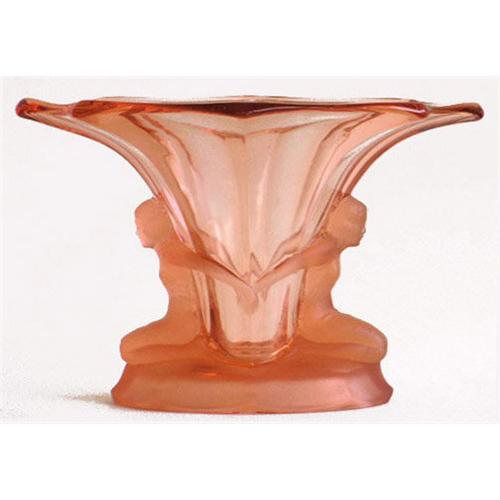Produced by Auguste Walther & Sohne, circa 1925, and known as 'Windsor'. This spectacular salmon pink Art Deco vase features two gorgeous pink satin glass Flappers sitting back to back with the base of the vase between them, and with their arms extended backward, as if supporting it. The vase stands 8 1/2" tall and is 10 3/4" x 7" across the rim and 7" x 4" across the base. This superb salmon pink Art Deco vase is in excellent condition.
