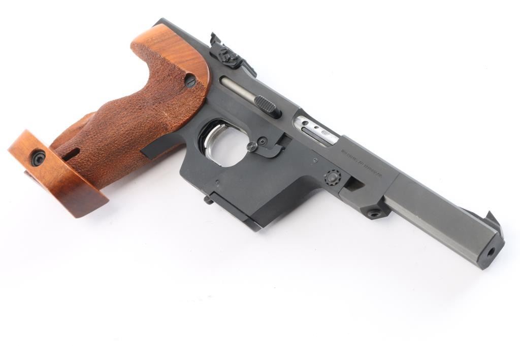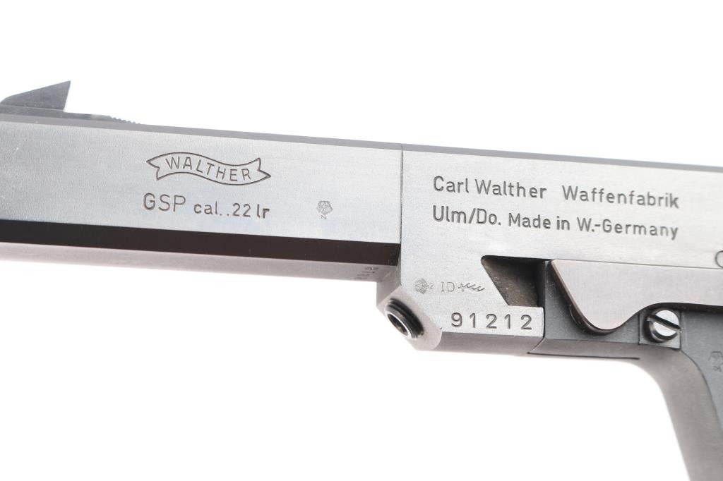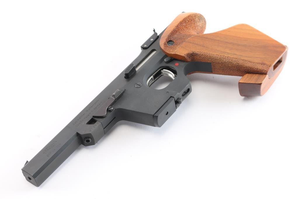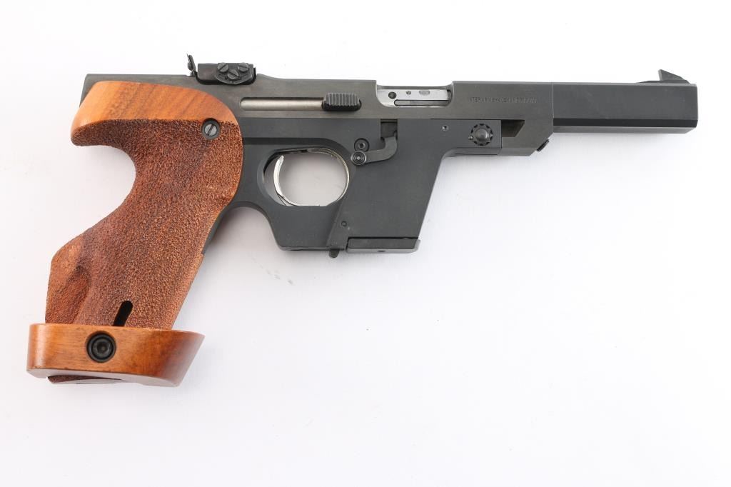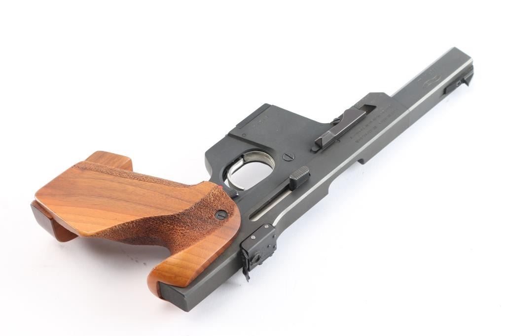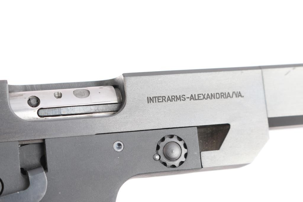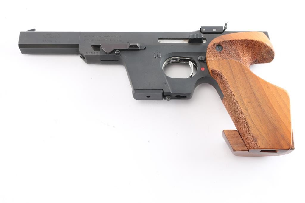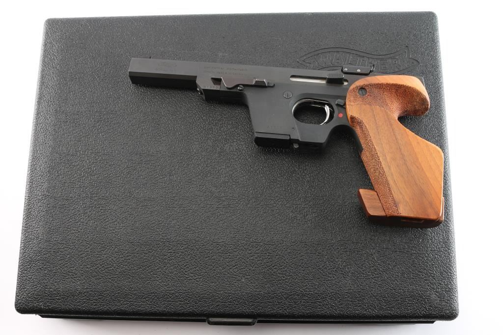 Semi automatic, precision targetshooting pistol with an unlocked breech action made in West Germany by Walther, imported by Interarms.. Manufactured 1983 (Date Code "ID"). Features a 4.5" barrel. 5-rd magazine. Fixed front blade , fully adjustable rear sights. Interchangeable trigger assembly. Walther 1360 trigger installed. Grooved rough-textured hardwood grips with adjustable hand rest for right-handed shooting. duel charging handles, right mounted slide stop and take-down lever, left thumb safety. Standard Walther markings with "Made in Germany" on left slide. Right slide stamped "Interarms, Alexandria Va".Nitro proofs present. Matching serial numbers. Blued slide, barrel, and matte black frame are about 99% with very minor scratches. Bore appears excellent/bright. Grips are excellent. Comes in the original Walther black plastic carry case matched to the pistol. Extra magazine, take-down tools, cleaning gear, manual, and spare serrated trigger. All in very good condition.