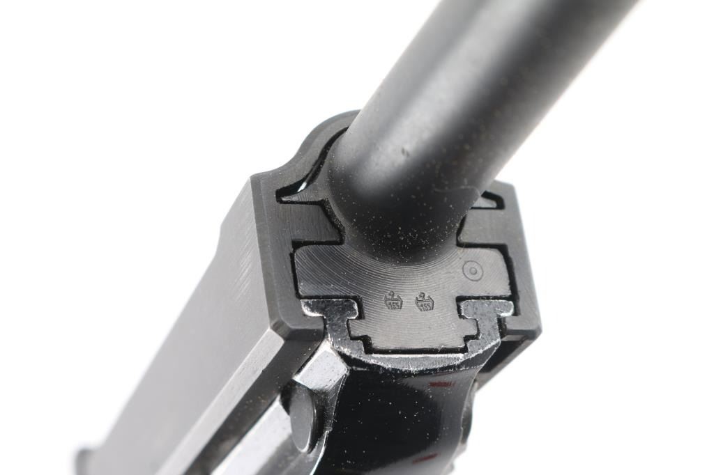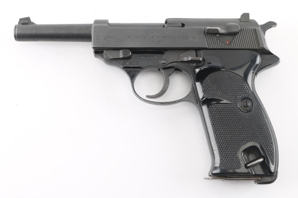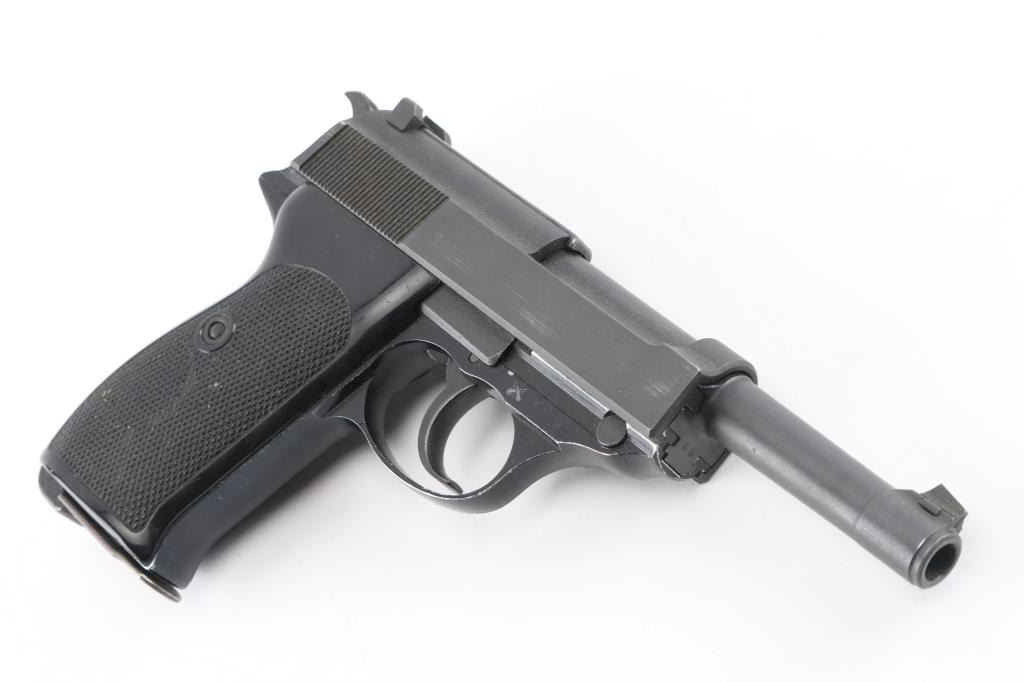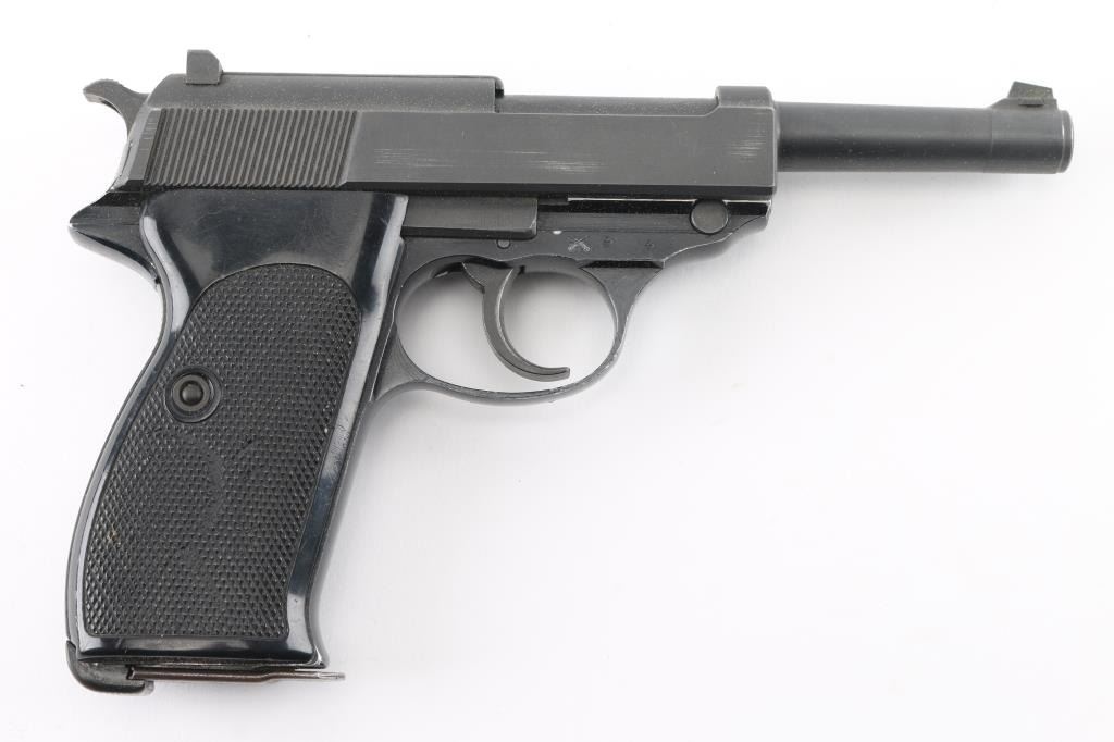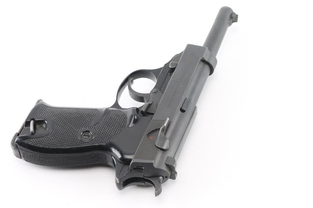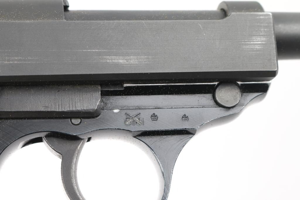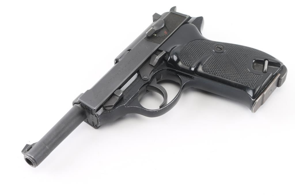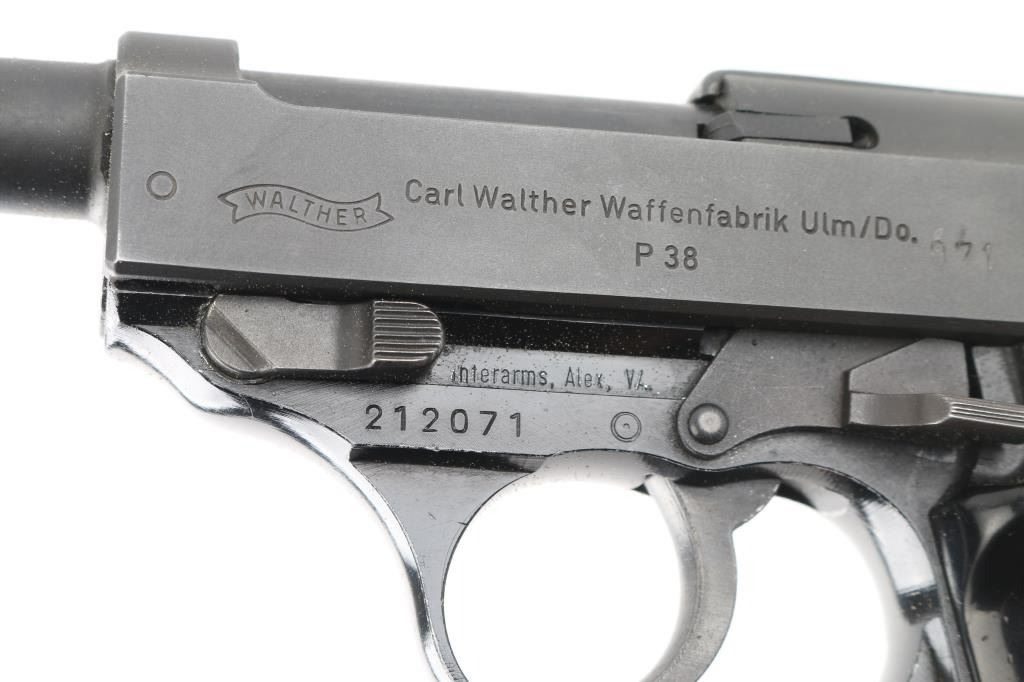 German double action semi-automatic pistol chambered in 9x19mm, imported by Interarms, Alexandria VA. Features a dark gray parkerized finish on steel parts and black anodized finish on the aluminum alloy frame, 4.9" barrel, dovetailed blade front sight, square notched rear sight, smooth trigger, serrated hammer spur, thumb safety/decocker, lanyard loop on frame, heel magazine release, factory 8 round magazine (Walther banner "P38" marked) and two-piece checkered black plastic grips. Bore is very good. Retains 90% finish with scuffs and edge losses. "BMI" marking (for German Federal Ministry of the Interior, Building and Community) on framed crossed out with large "X" stamp. "071" stamped on slide (lightly, appears after manufacture). Barrel marked "239". Serial number indicates early 1960's manufacture. Condition is NRA Very Good++ *** C&R Firearm ***