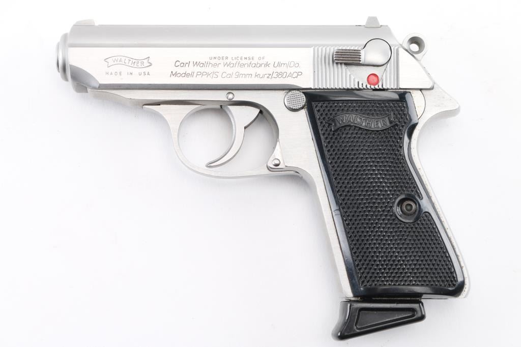 SN: S015634. American made stainless steel double action semi-automatic compact pistol chambered in .380 Auto, produced by Interarms under license of Walther. Features a matte/brushed finish, 3.3" barrel, fixed front sight with orange dot, dovetailed rear sight with square notch & orange bar, serrated trigger, serrated round hammer spur, thumb safety/decocker on the left side of the slide, loaded chamber indicator on the rear of the slide, push button magazine release, factory 7 round magazine with finger rest floorplate, and two-piece checkered black plastic grips with Walther banners. . Pistol exhibits very little wear with only a couple light scuffs & scratches observed. Action is crisp, the bore is pristine and the synthetic grips are fine. Matching serial numbers. NRA Condition-Excellent. Modern firearm.