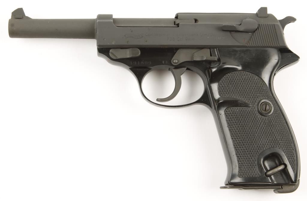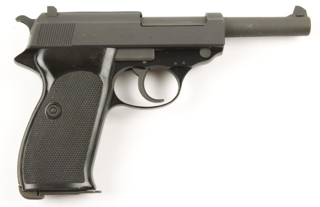 German made double action semi auto pistol with 5" barrel. Parkerized finish, checkered black plastic grips, left side thumb safety and fixed sights. Dated 11/62. Very good bore and action. Includes 1 magazine. Condition: Very good showing handling.