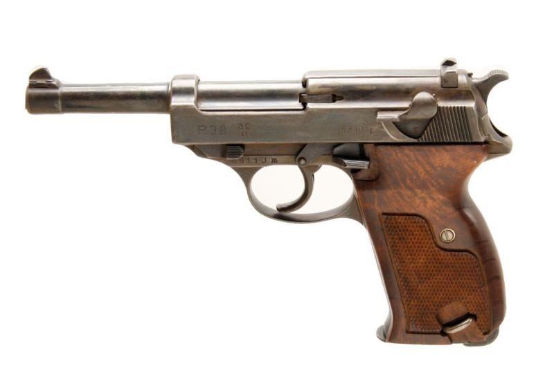 Walther Mdl P-38 Cal 9mm SN:6811J Double action semi-auto pistol, with Nazi proofs and "AC 41" code on the left side of the slide. Originally blued finish, walnut replacement grips, 5" barrel, good bore and action. Not import marked. Condition: OveraDouble action semi-auto pistol, with Nazi proofs and "AC 41" code on the left side of the slide. Originally blued finish, walnut replacement grips, 5" barrel, good bore and action. Not import marked. Condition: Overall good with replacementgrips. Finish has thinned and appears to have had cold blue applied in some areas.