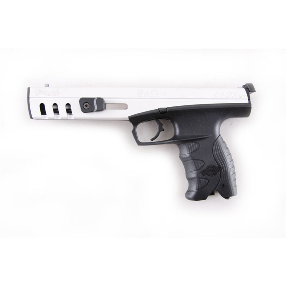 Walther Mdl SP22 M2 Cal .22LR SN:KL001027 Single action semi-auto 10 shot pistol made in Germany for Smith & Wesson. Aluminum barrel housing with black polymer frame and molded in pebbled grips, 6" barrel with adjustable sights, good bore and action. InSingle action semi-auto 10 shot pistol made in Germany for Smith & Wesson. Aluminum barrel housing with black polymer frame and molded in pebbled grips, 6" barrel with adjustable sights, good bore and action.Included in black plastic carry case with instructions, tools, and gun lock. Condition: Near new with no sign of use. No magazine.