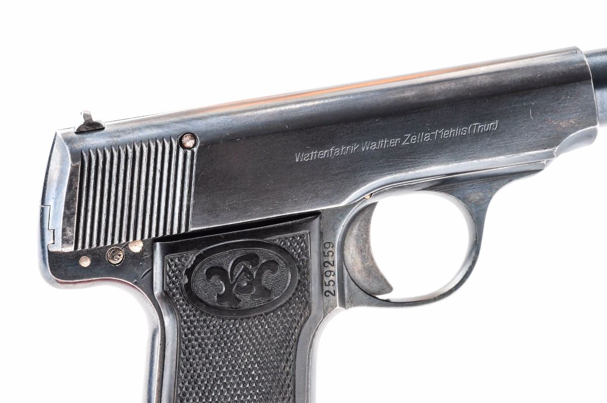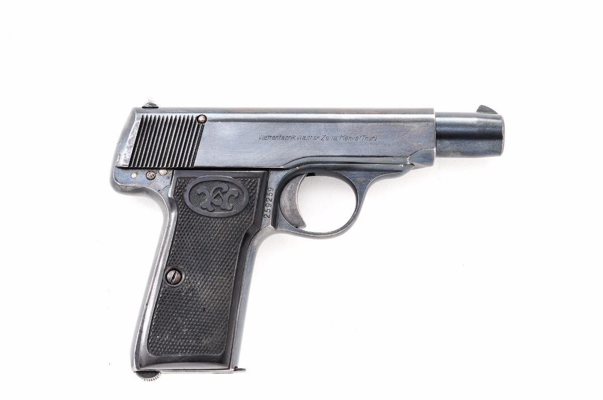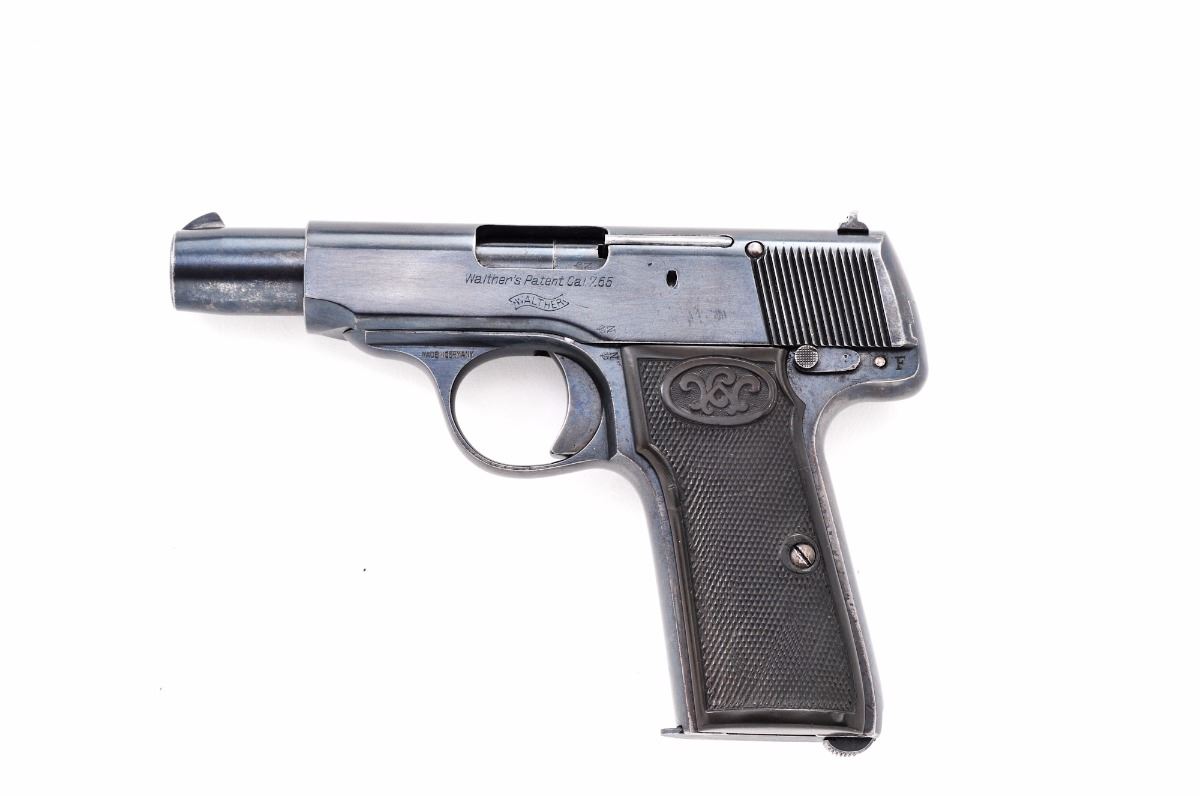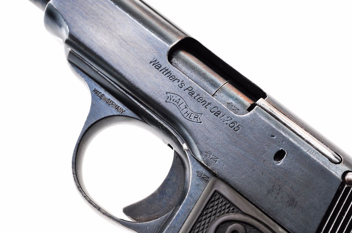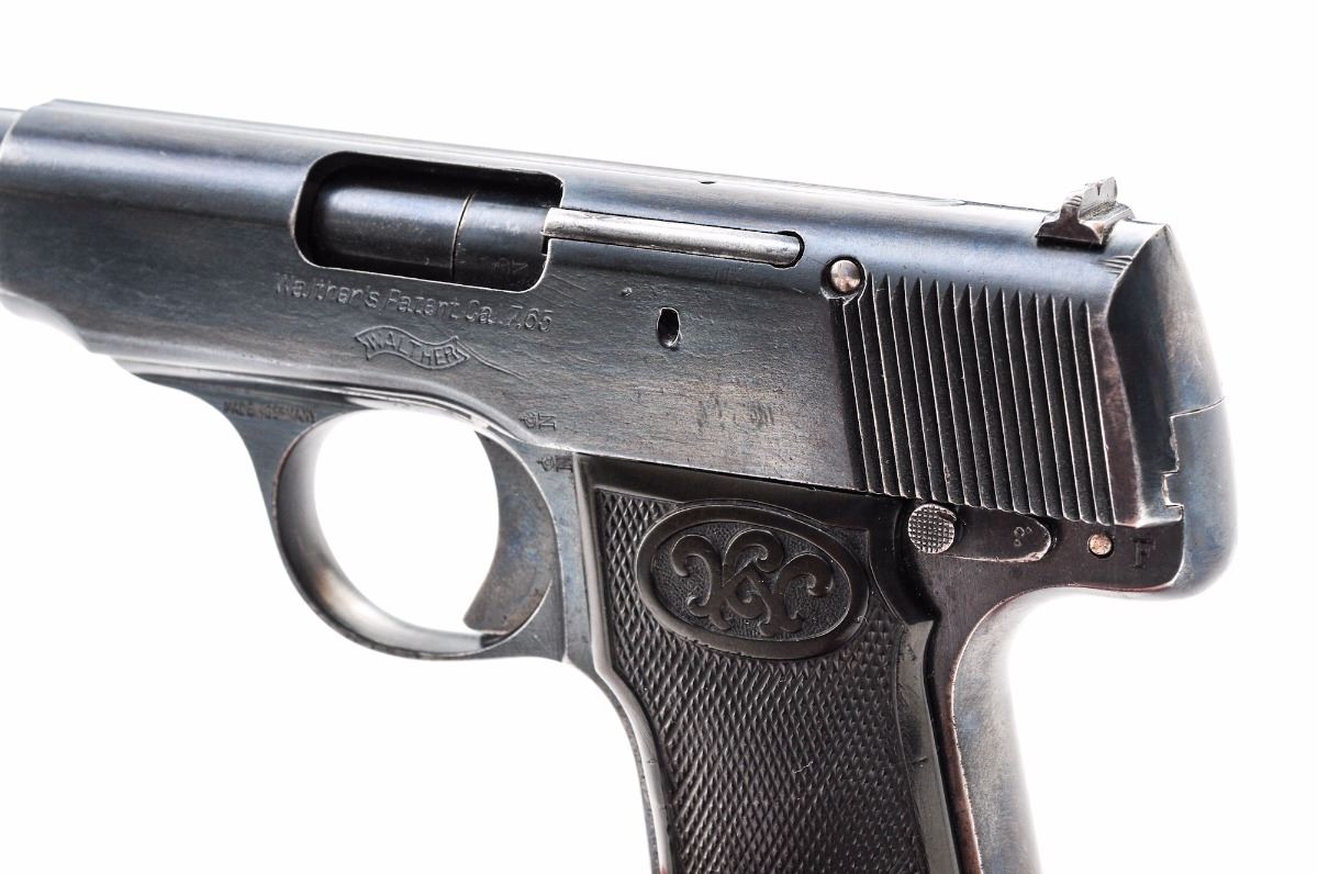 Walther Model 4 Semi-Automatic Pistol, #259259, 7.65mm (.32 ACP) cal., 3.5'' barrel, blue finish, checkered hard rubber grips, blade front sight and dovetailed ''V''-notch rear sight, with ''(crown)/N'' proofs. Import marked ''Made in Germany''. Condition is excellent as reblued, retaining approx. 98% re-blued finish with light pitting under blue on slide. Grips show slight wear and flattening to the checks. Action is tight, bore is bright. Est.: $250-$450. (C&R)