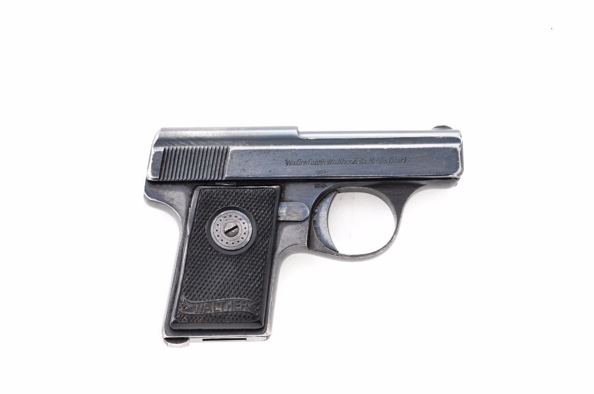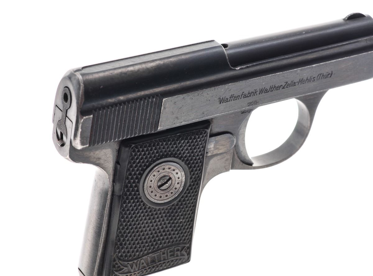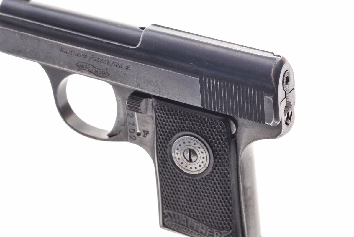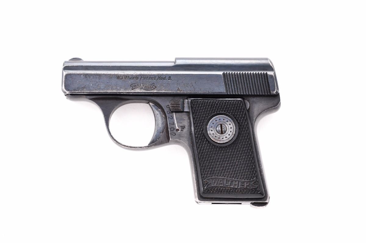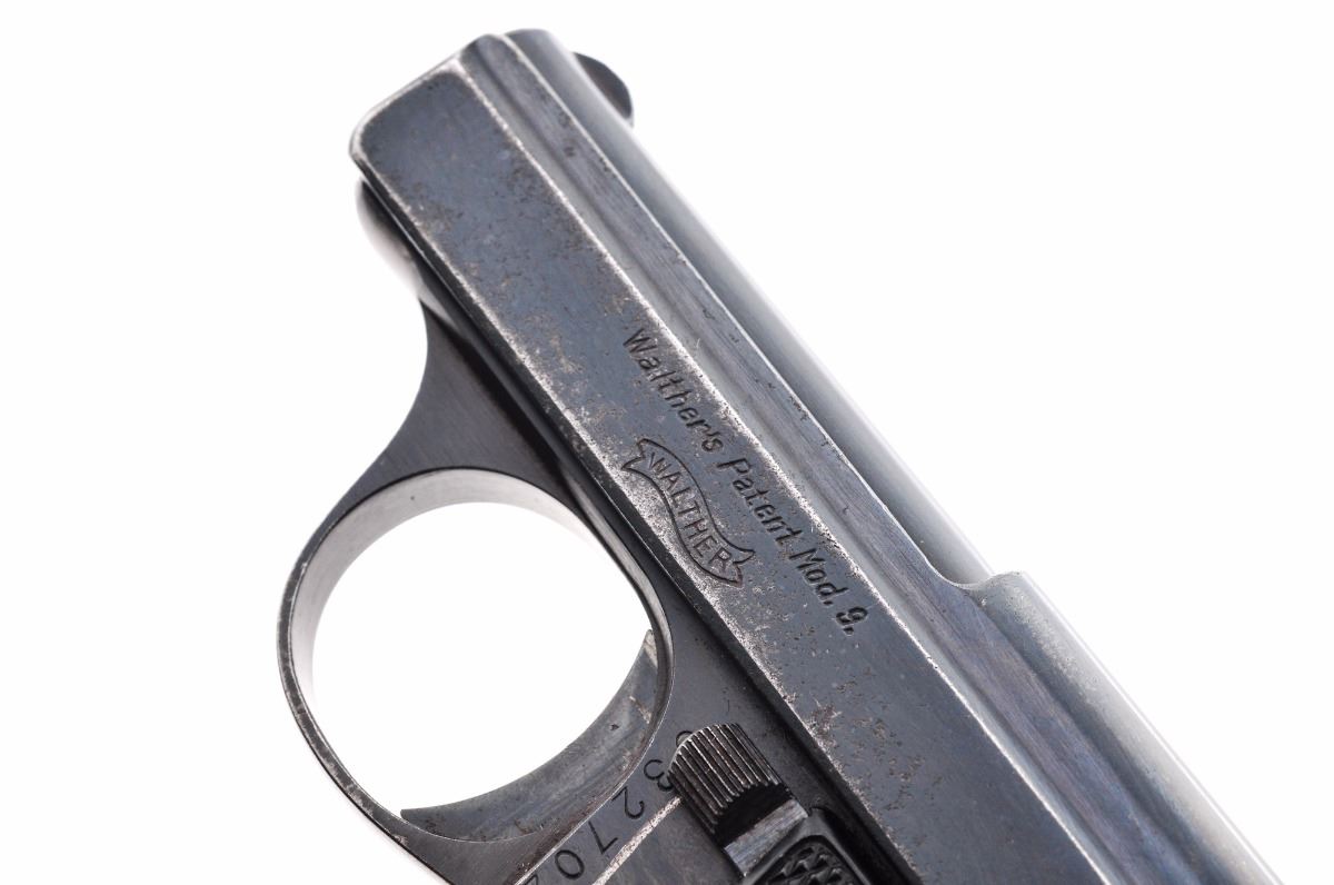 Walther Model 9 Type II Semi-Automatic Pistol, #632702, 6.35mm (.25 ACP) cal., 2'' barrel, blue finish, checkered hard rubber grips, blade front sight and slide notch rear sight, with one Walther marked magazine. Mfg'd approx. 1933. Condition is very good retaining approx. 98% original blue finish with scattered freckling overall. Grips are very good with slight flattening to the checks. Action is tight, bore is bright. Est.: $300-$450. (C&R)
