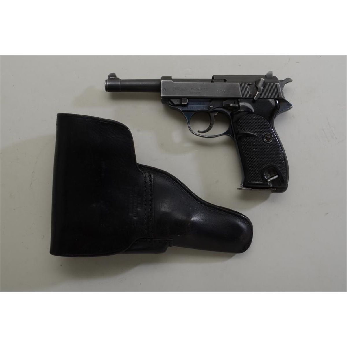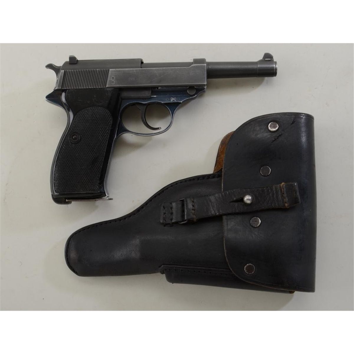 Walther Model P1 DA semi-auto pistol, 9mm cal., 5” barrel, military parkerized slide and barrel with blued frame, checkered black plastic grips, import-marked, #218384, accompanied by a black leather military orpolice style flap holster. This gun is in overall very good + condition showing the majority of its finish, very good bore, crisp action, sharp markings, good to very good grips, lanyard ring; leather holster is inoverall good condition. Est.: $200-$400.