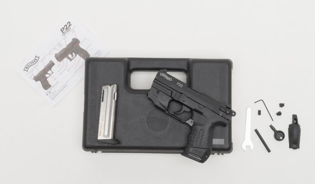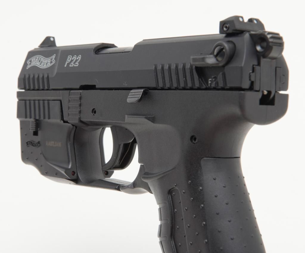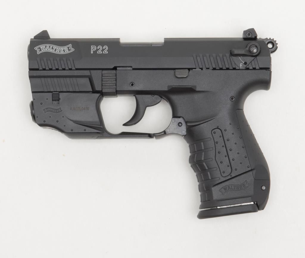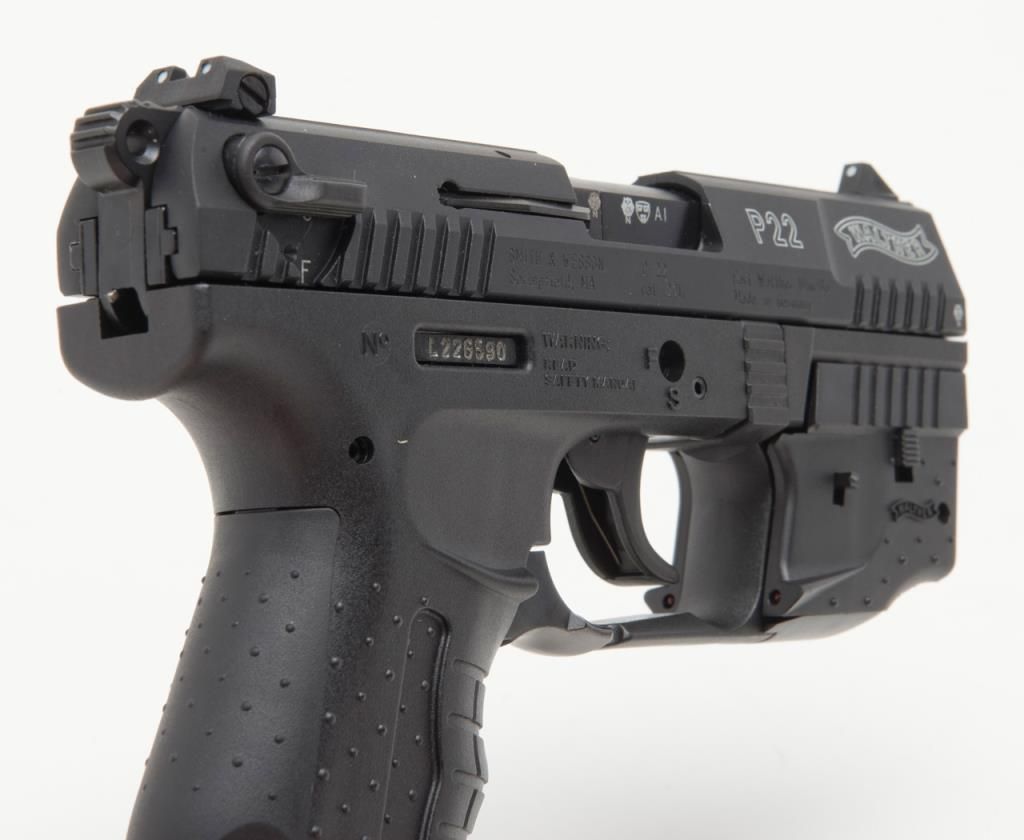 Walther Model P22 DA semi-auto pistol, 3-1/2” barrel, mat black finish, polymer frame, #AA07L0416 in like new condition with extra magazine, instructions manual, under barrel laser sight, gun lock, takedown tool, grip extender andpadded hard carry case. (Antique). Est.: $350-$700.