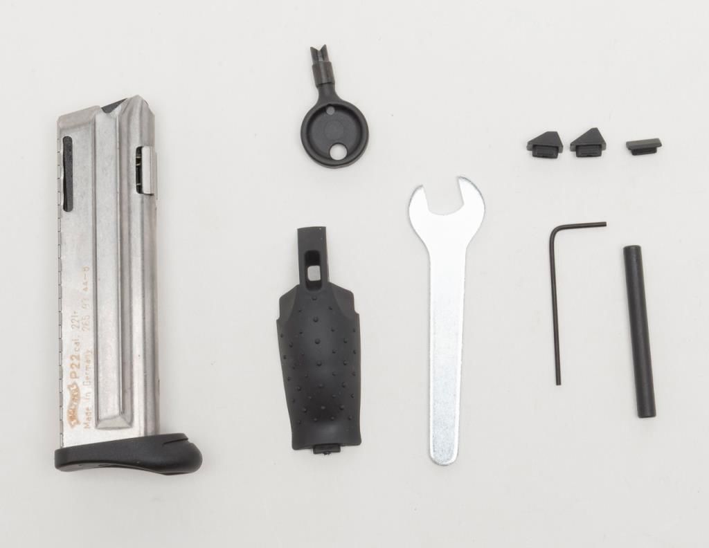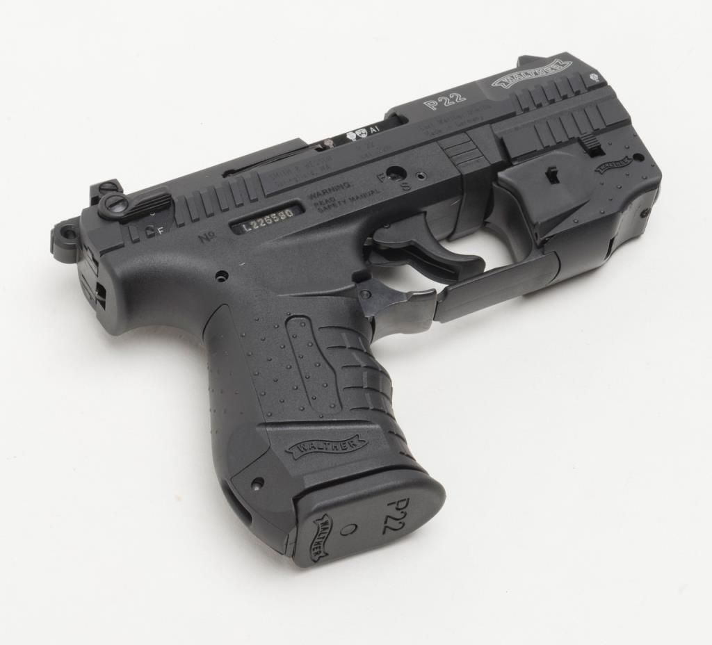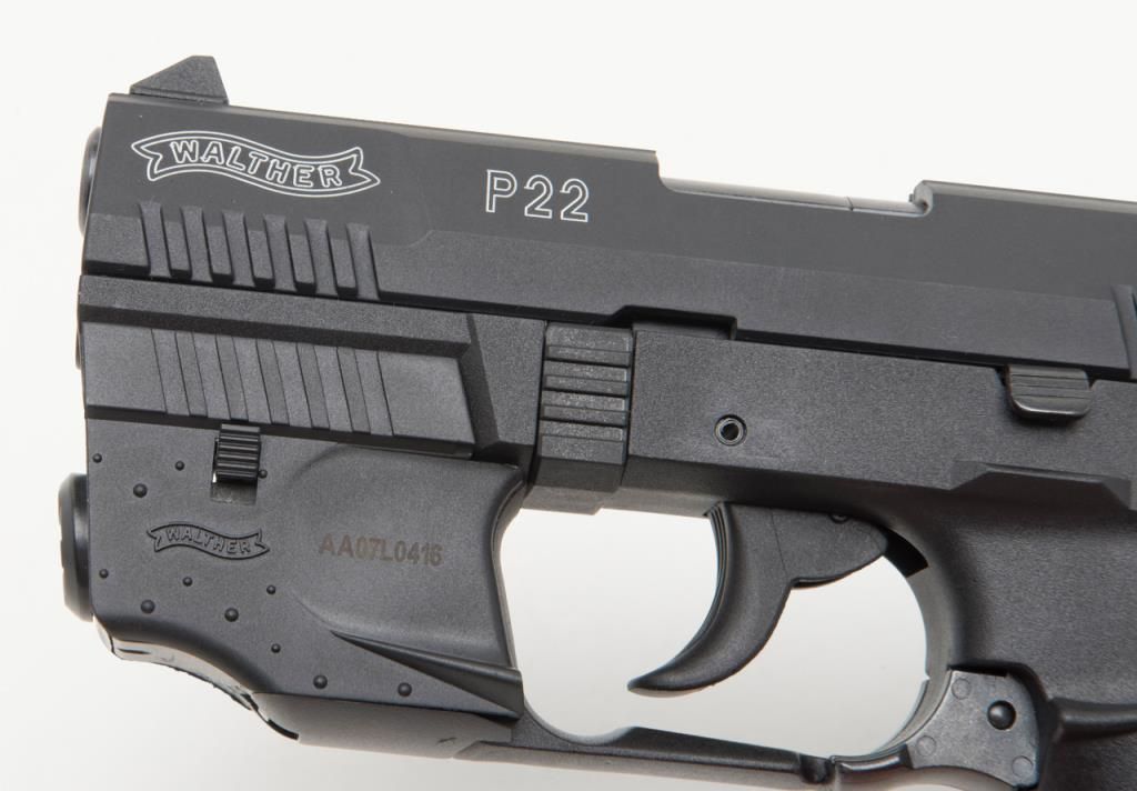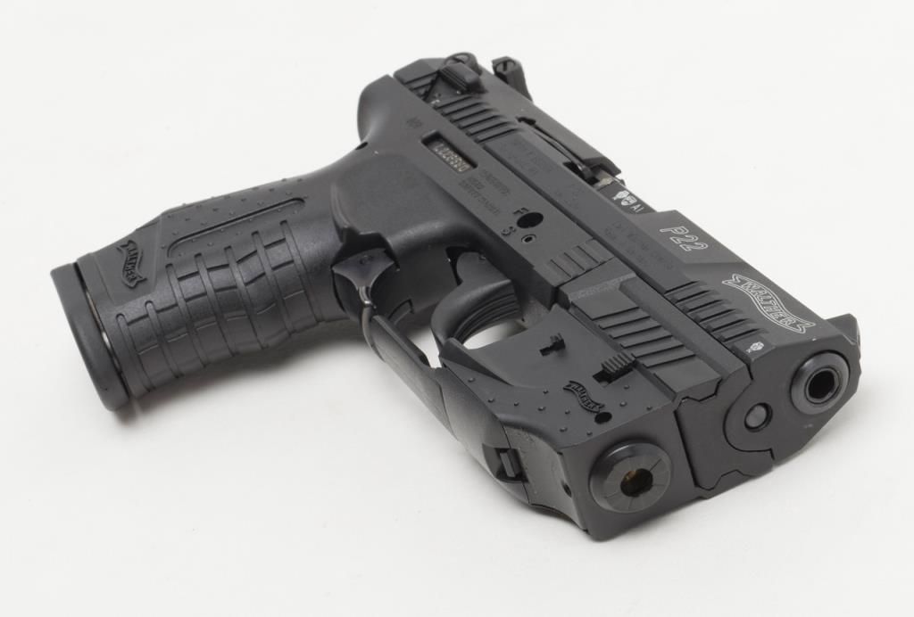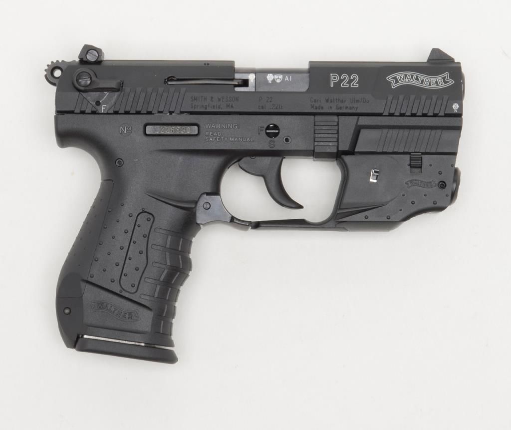 Walther Model P22 DA semi-auto pistol, 3-1/2” barrel, mat black finish, polymer frame, #AA07L0416 in like new condition with extra magazine, instructions manual, under barrel laser sight, gun lock, takedown tool, grip extender andpadded hard carry case. (Antique). Est.: $350-$700.