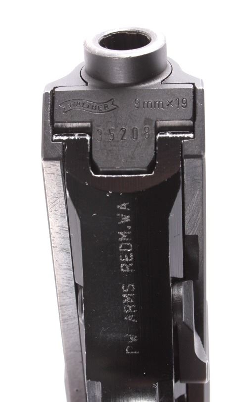 This is a Walther Model P5 semi-automatic pistol chambered in the 9mm caliber with box. The pistol features a blued frame with a parkerized slide and checkered grips. The slide is marked "Walther P5 Carl Walther Waffenfabrik Ulm/Do." and "9/83". The Walther P5 is in good condition and comes with the original box and extra magazine. The pistol measures 5" x 7". Serial number is 035208. This is a modern manufactured firearm and requires an FFL or NICS background check for transfer.