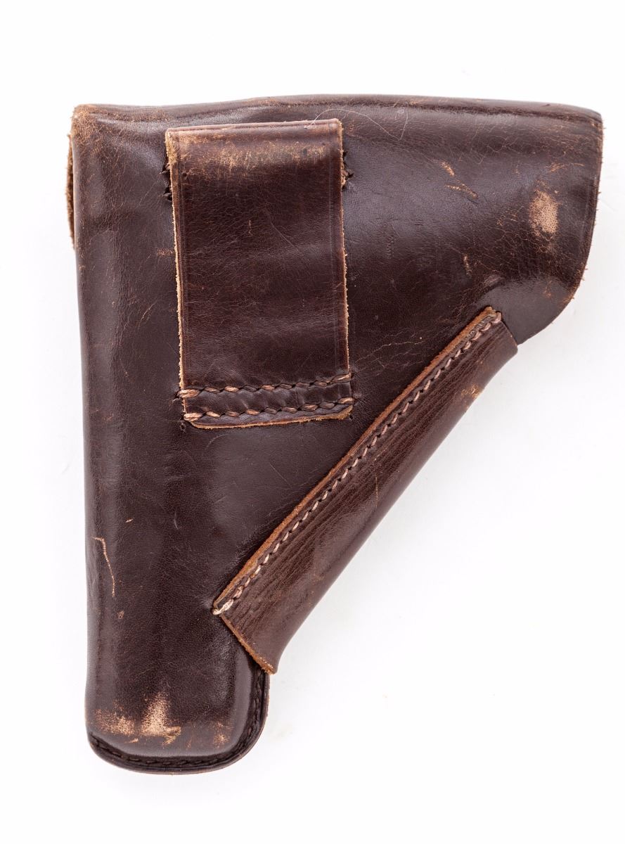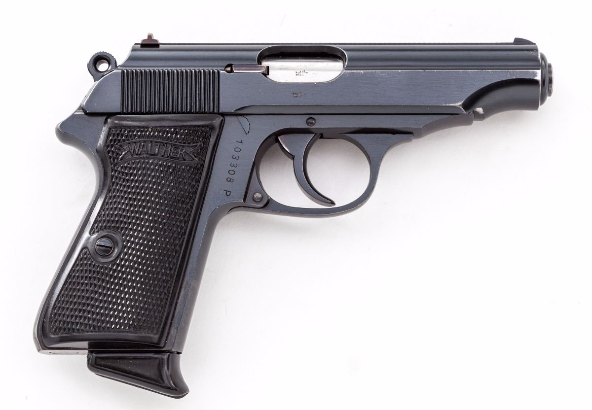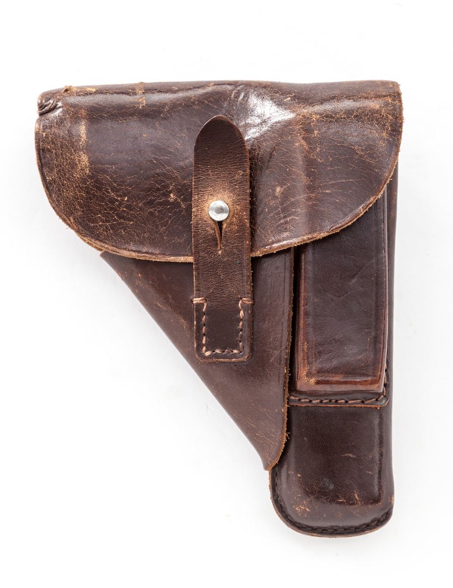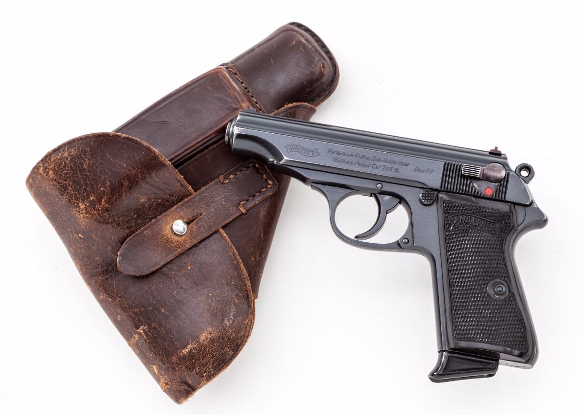 Walther Model PP Semi-Automatic Pistol, #103308P, 7.65mm (.32 ACP) cal., 4'' barrel, blue finish, checkered black plastic grips, blade front sight and dovetailed ''U''-notch rear sight, with ''(crown)/N'' proofs and one magazine. Includes an excellent condition unmarked three-flap brown leather holster. Condition is excellent retaining approx. 95% original factory finish with slight loss to slide near muzzle, and micro-scratches to slide with very light freckling in isolated places. Grips are excellent. Action is tight, bore is bright. Est.: $500-$750. (C&R)