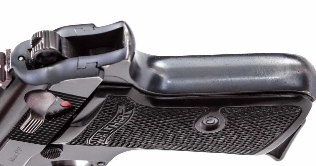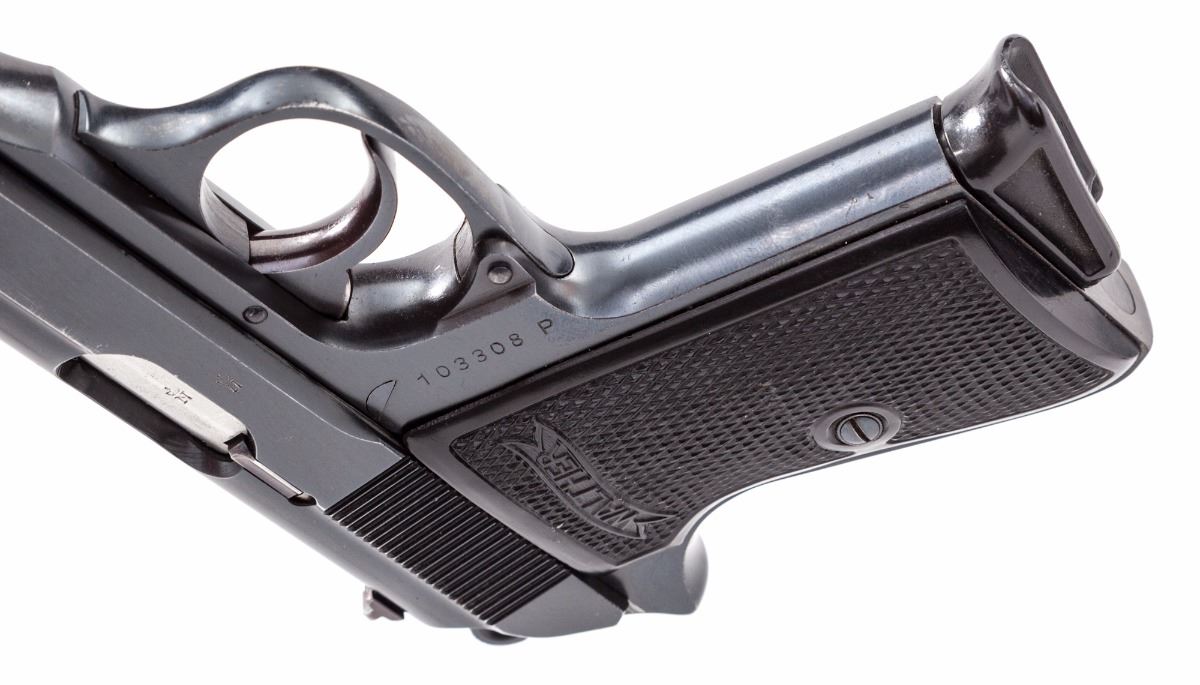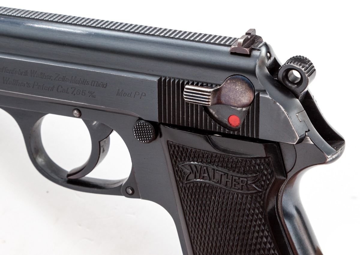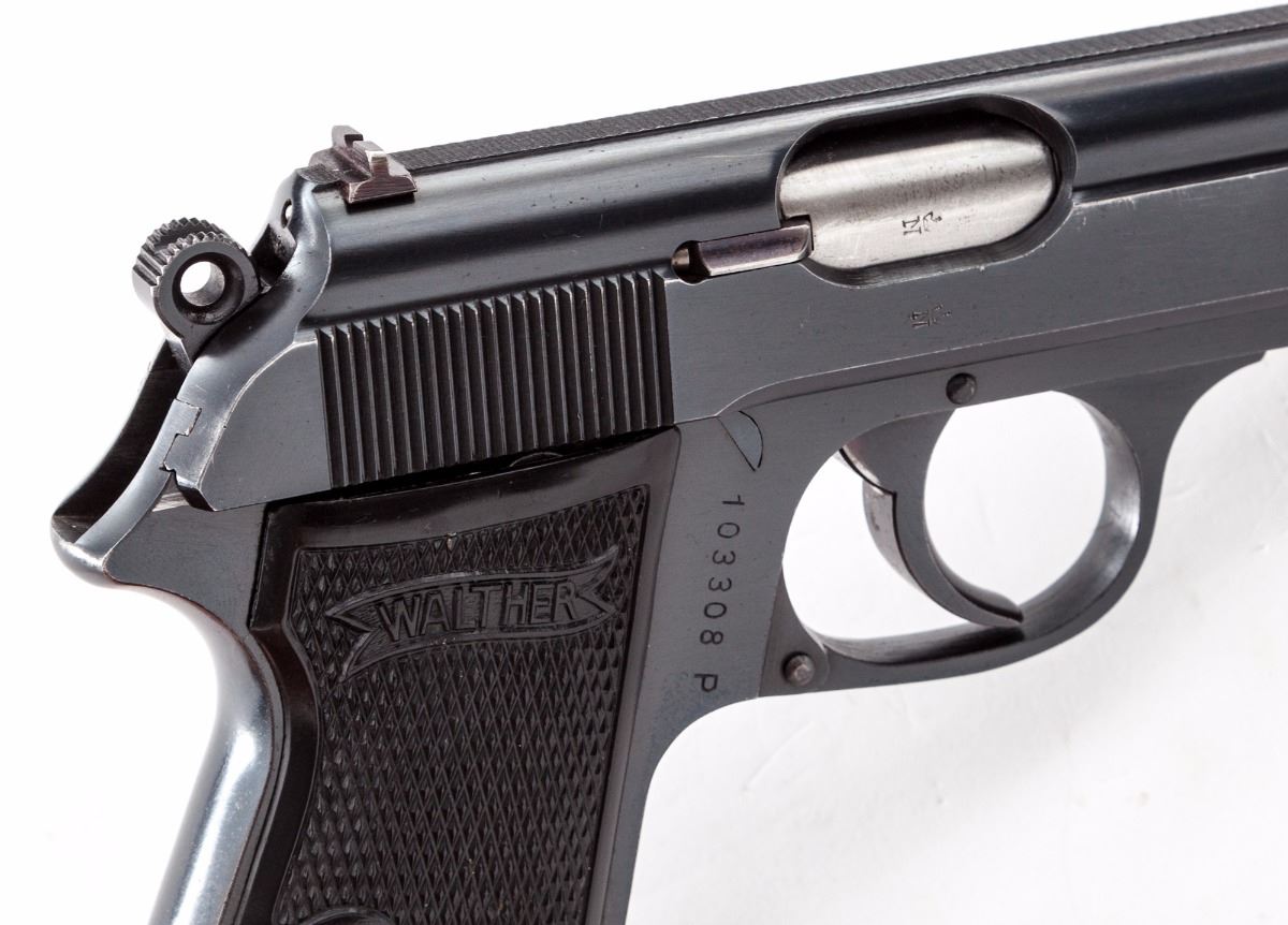 Walther Model PP Semi-Automatic Pistol, #103308P, 7.65mm (.32 ACP) cal., 4'' barrel, blue finish, checkered black plastic grips, blade front sight and dovetailed ''U''-notch rear sight, with ''(crown)/N'' proofs and one magazine. Includes an excellent condition unmarked three-flap brown leather holster. Condition is excellent retaining approx. 95% original factory finish with slight loss to slide near muzzle, and micro-scratches to slide with very light freckling in isolated places. Grips are excellent. Action is tight, bore is bright. Est.: $500-$750. (C&R)