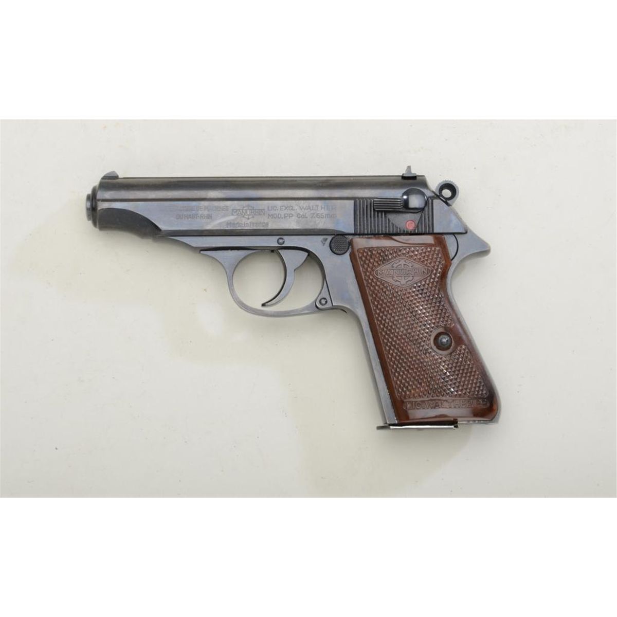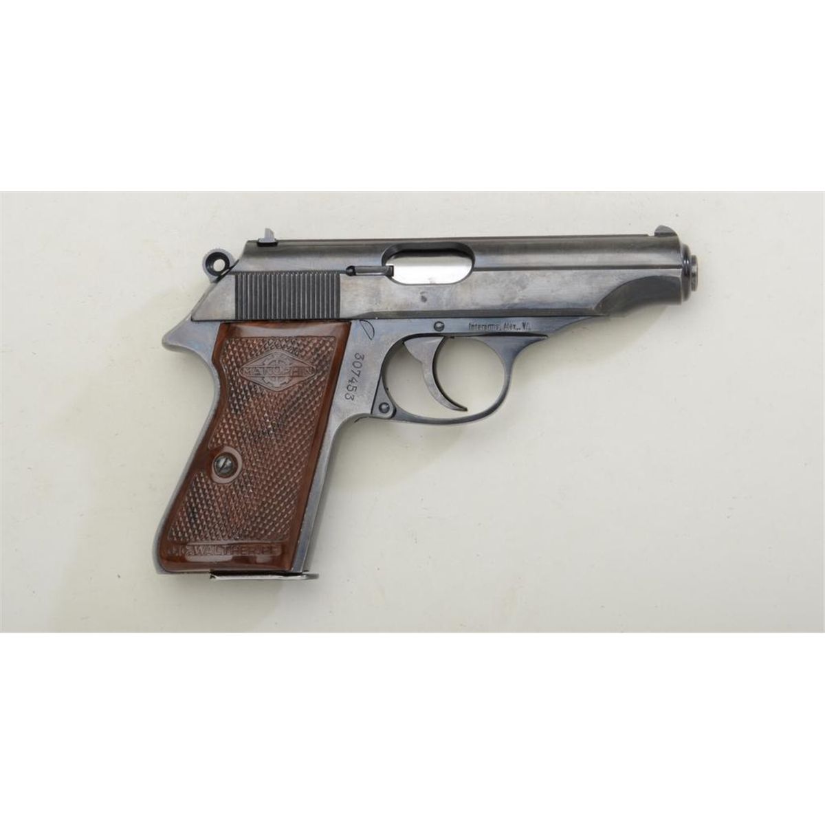 Walther Model PP semi-auto pistol by Manurhin, imported by Interarms, 7.65 cal., 3-3/4” barrel, black finish, checkered mottled brown plastic grips, #307453 in factory two piece brown pebble finishcardboard box with cleaning rod and extra magazine. This gun is in overall excellent condition showing approx. 99% original finish, fine bore, action, markings and grips; extra magazine has extended fingerrest; box is overall very good to fine. Est.: $300-$600.