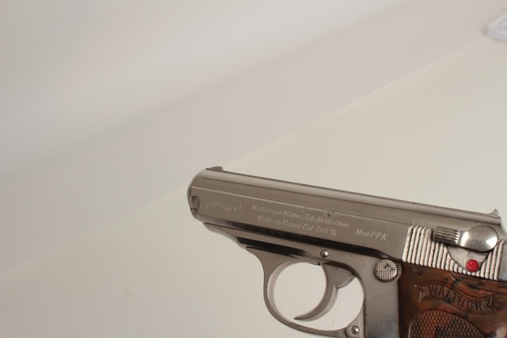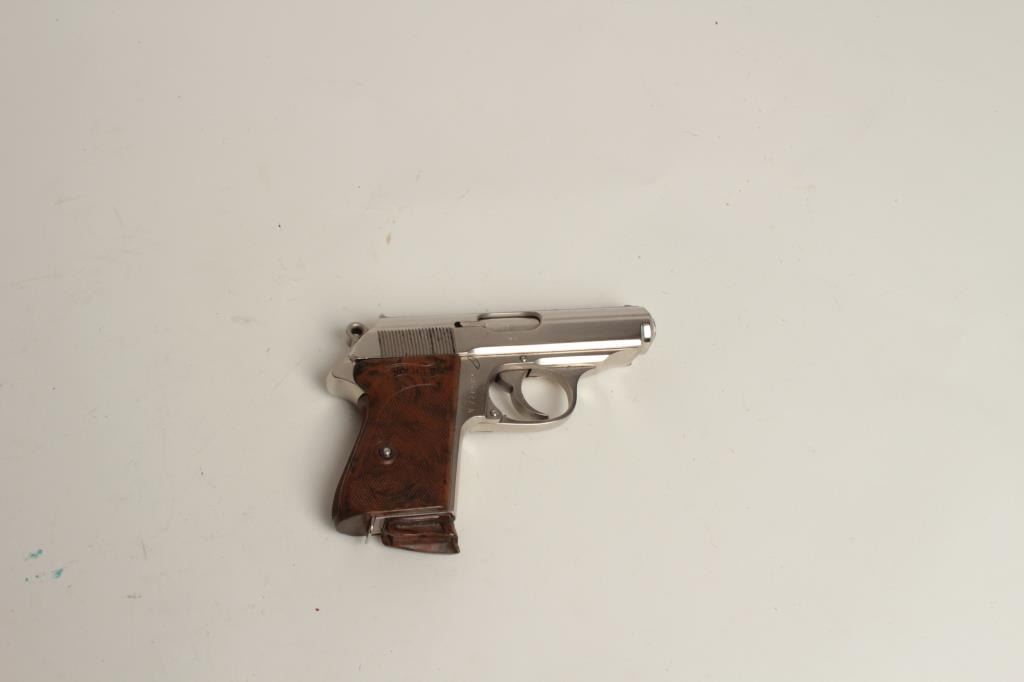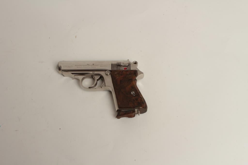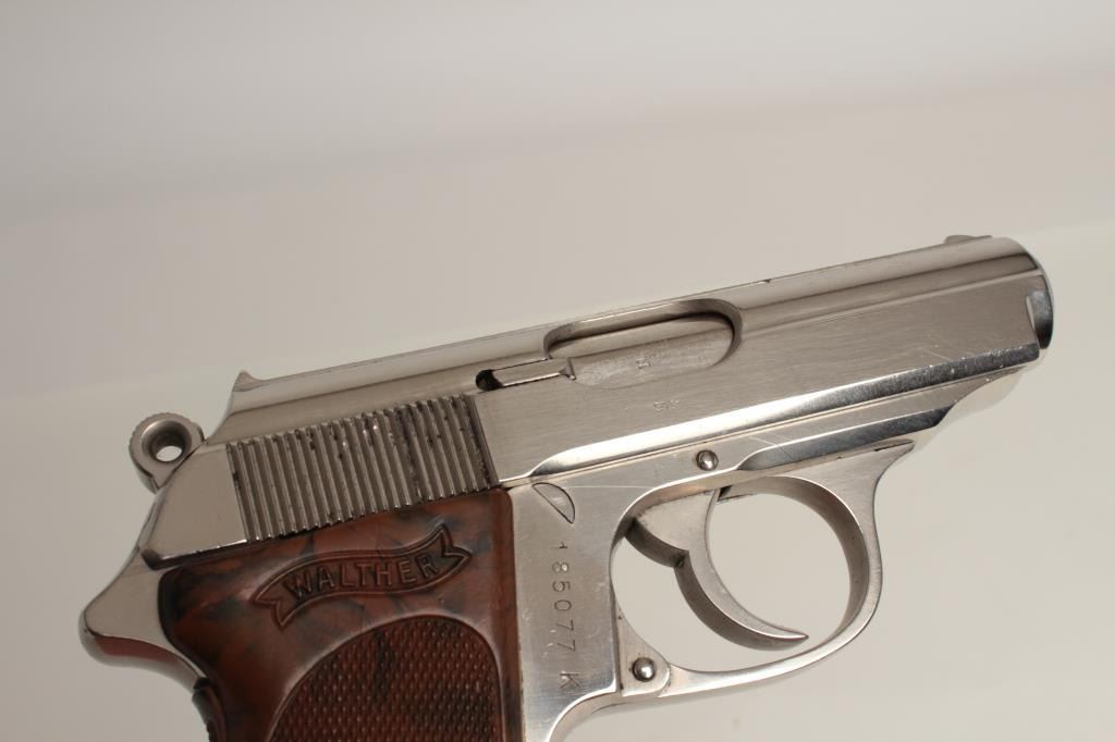 3” barrel, old re-nickel finish, probably during use with extra fine grips, S/N 185077K, overall very good with a good bore, crisp action and sharp markings; finger rest at bottom of magazine shows a small loss. (Modern/PPT). Est.: $500-$1,000