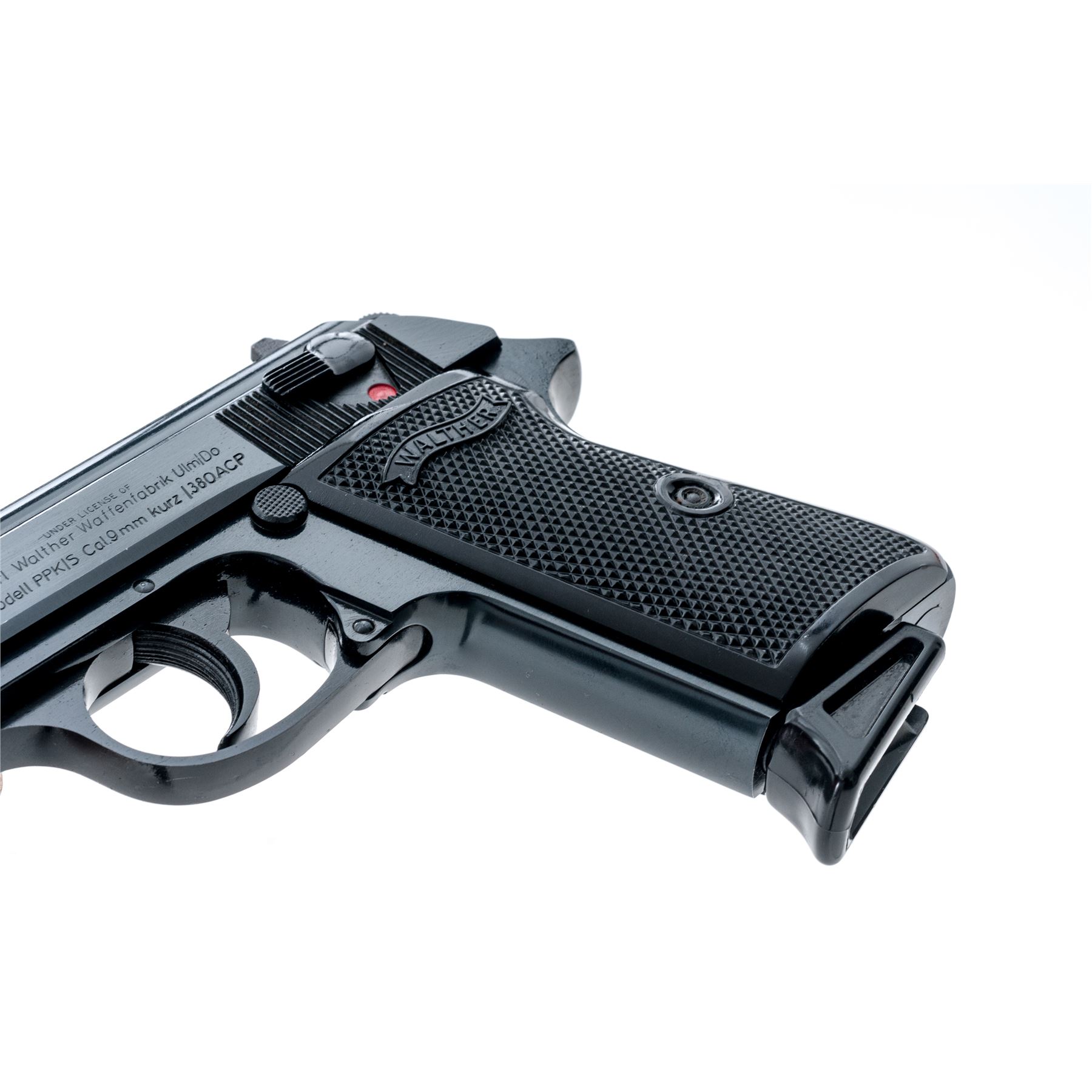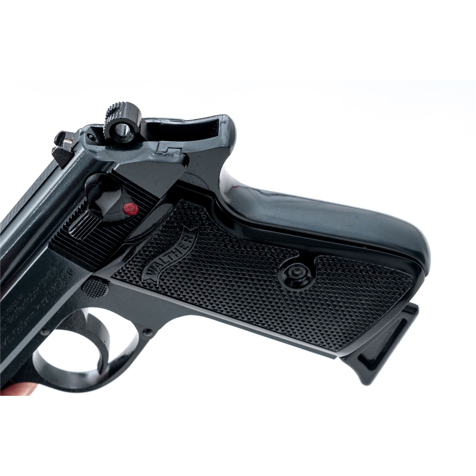 Walther Model PPK/S Semi-Automatic Pistol, #027911, .380 ACP cal., 3.25'' barrel, blue finish, checkered black plastic grips with ''Walther Banner'' logo, standard sights with white highlights, and three (3) Walther magazines, two (2) with black plastic finger extensions.  In original black plastic Walther box, with test target that was used but the firearm information was not filled out, owner's manual, and warranty paperwork.  Right side of slide is marked ''Interarms/Alexandria, Virginia''.  Made in U.S.A.  Condition is excellent retaining approx. 98% original blue finish, with some fine micro-scratching, slide with a few spots of mild edgewear.  Factory lettering is clear and defined.  Grips are also excellent with only a few minor handling marks to the smooth borders.  Smooth action, bright bore with excellent rifling.  Overall a nice pistol that shows normal signs of only light range use.  Box with black duct tape repairs to some of the edges.  Est.:  $500-$700. (Modern/PPT)