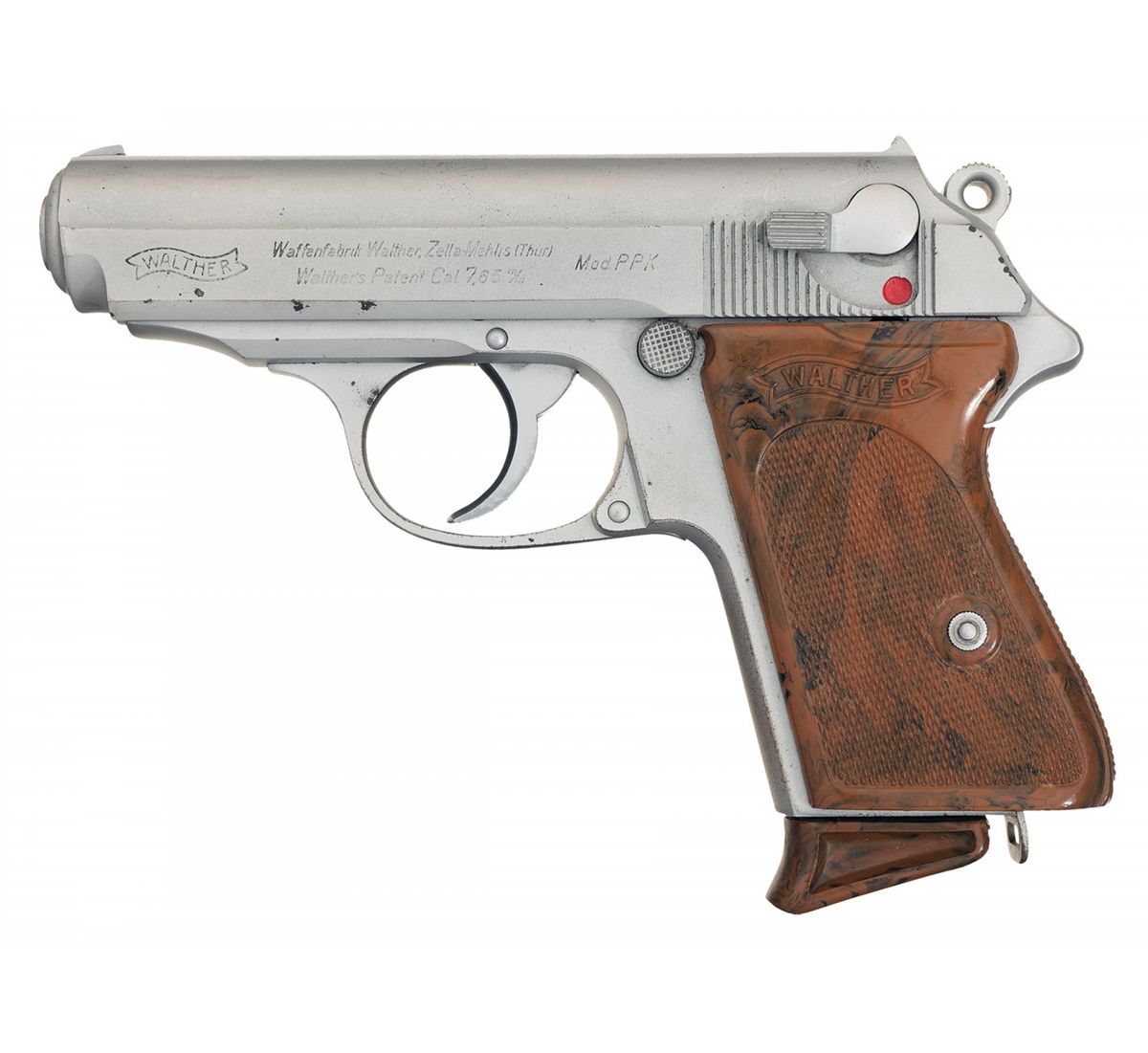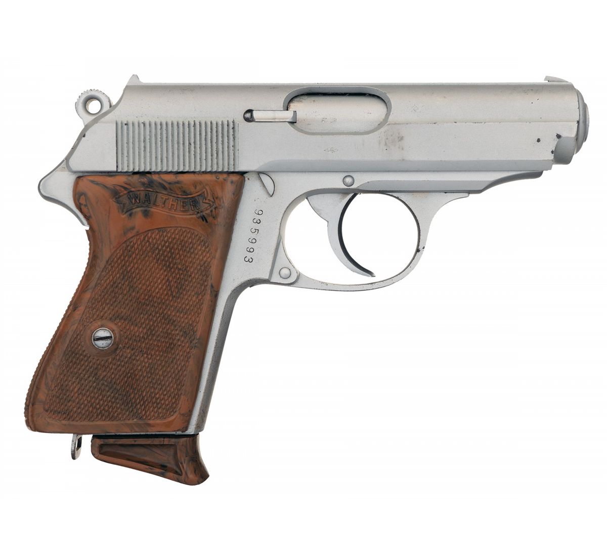 Produced before the outbreak of World War II, this PPK shows the scarce matte chrome "verchromt" finish. Fixed sights, with black fill in the Walther banner, 2-line address and caliber marking, and "Mod. PPK" on the left side of the slide, and "crown/ N" proofs on the slide, chamber and muzzle. Proper hand-marked partial serial number on the inside of the slide, with an early 90 degree safety, ring hammer, and checkered mixed brown Walther banner grips. With a proper verchromt finished magazine, with mixed brown extension base and "WALTHER" banner on the left side.