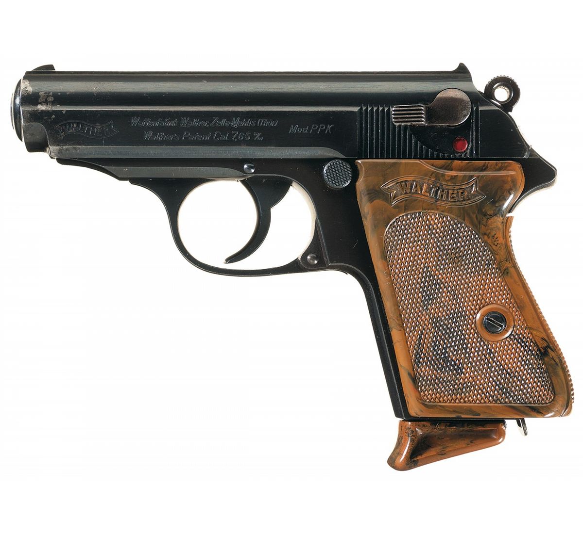 Blade front and notch rear sights with the left side of the slide bearing the Walther banner, 2-line address and caliber marking, and "Mod.PPK", with a ring hammer, smooth trigger, "crown/N" commercial proofs on the right side of the slide and chamber, and checkered wraparound Walther grips with matching magazine base extension. On the front strap is the marking "R.F.V. 199 KW", a marking associated with the Nazi Reichs Finance Ministry. PPKs and similar compact pistols were issued to the RFV's plain clothed agents who acted as detectives and investigators.