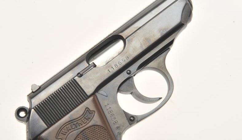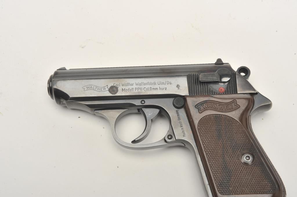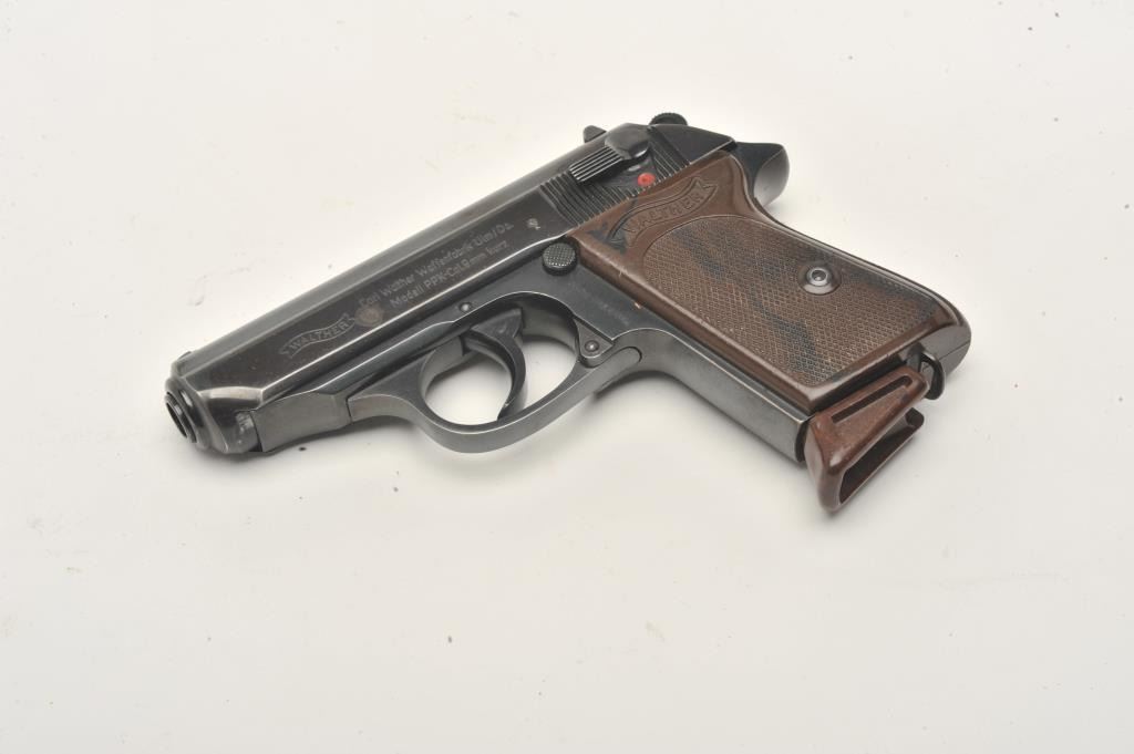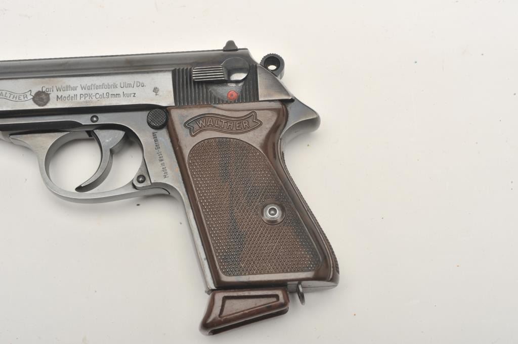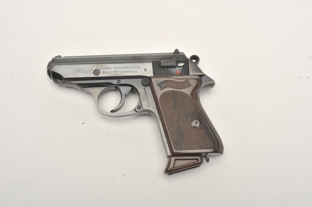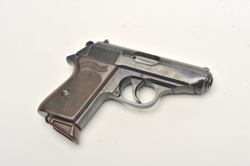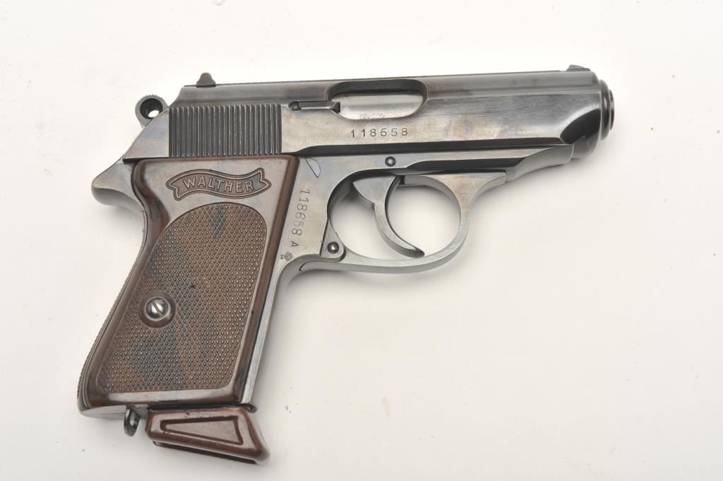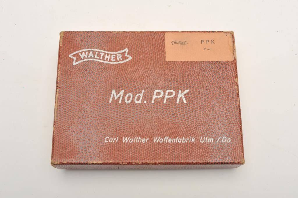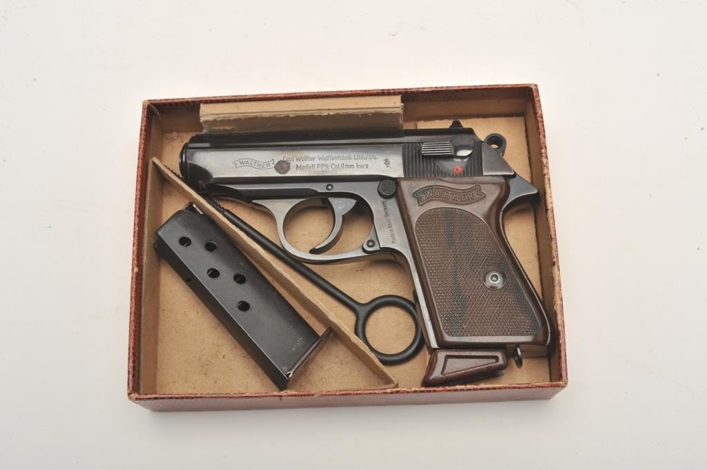 Walther Model PPK semi-automatic pistol, 9mm kurz caliber, 3.5” barrel, blued finish, checkered brown plastic grips, S/N 118658A, in factory brown two piece cardboard box with extra magazine and cleaning rod. This gunis in overall very good to fine condition showing the majority of its original blued finish with one spot of erosion on the left mid area of the slide; fine bore, crisp action, sharp markings and fine grips. Box is numbered to this pistol. (Modern/PPT). Est.: $600-$1,200.