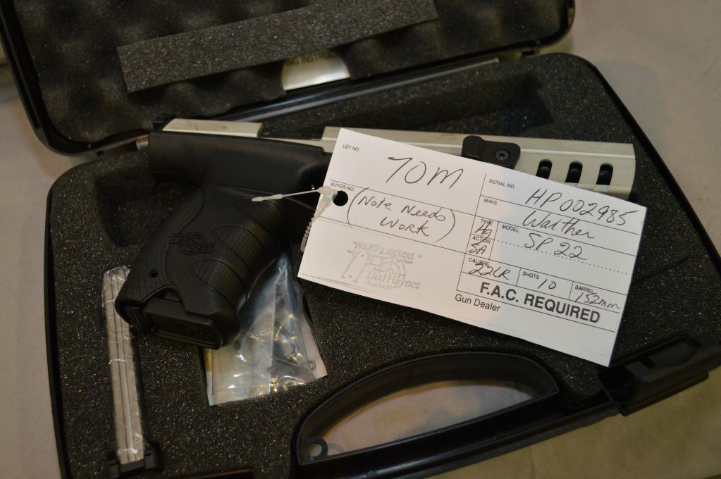Walther Model SP 22 .22 LR Cal 10 Shot Semi Automatic Pistol w/ 152 mm bbl [ Appears excellent in orig box, booklet, extra mag, & tools etc, NOTE ; NEEDS WORK, DOES NOT WORK PROPERLY - blue & grey finish with composite pistol grip, has original hanging tag ] Ser # HP 002985 Restricted Handgun Cert # 18412941