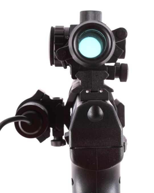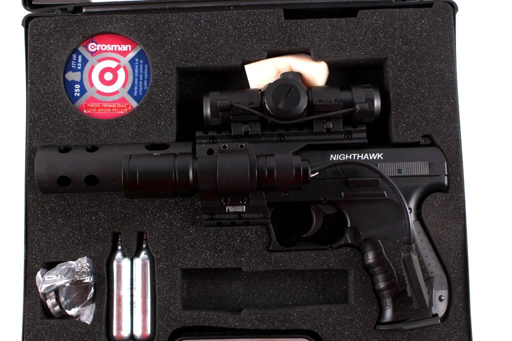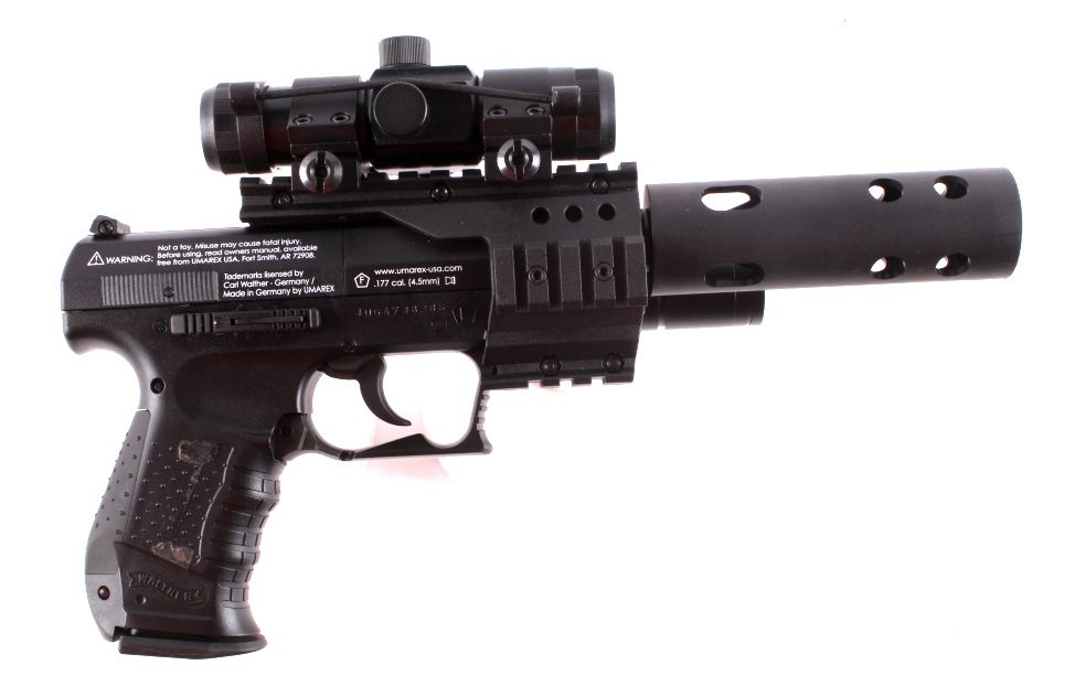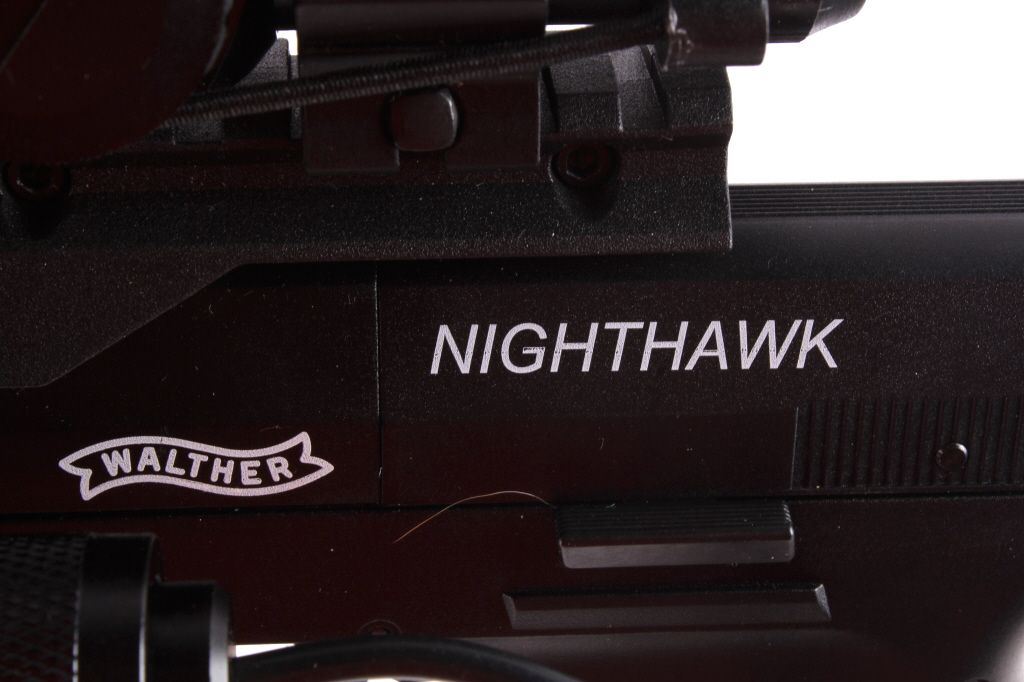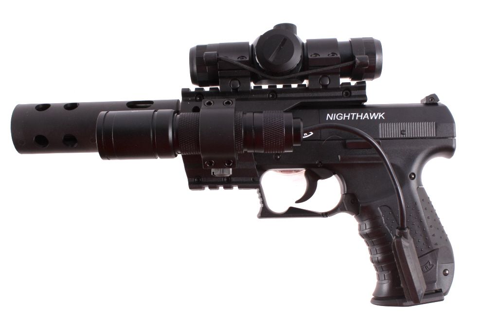 The lot features a Walther Nighthawk pellet hand gun. The piece features a tactical Walther red dot scope, Walther tactical attached light with squeeze release, silencer. The piece is all functioning and comes with extra CO2, hard case, targets, pellets, and more. This is a .177 pellet pistol, no FFL required.