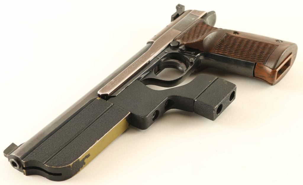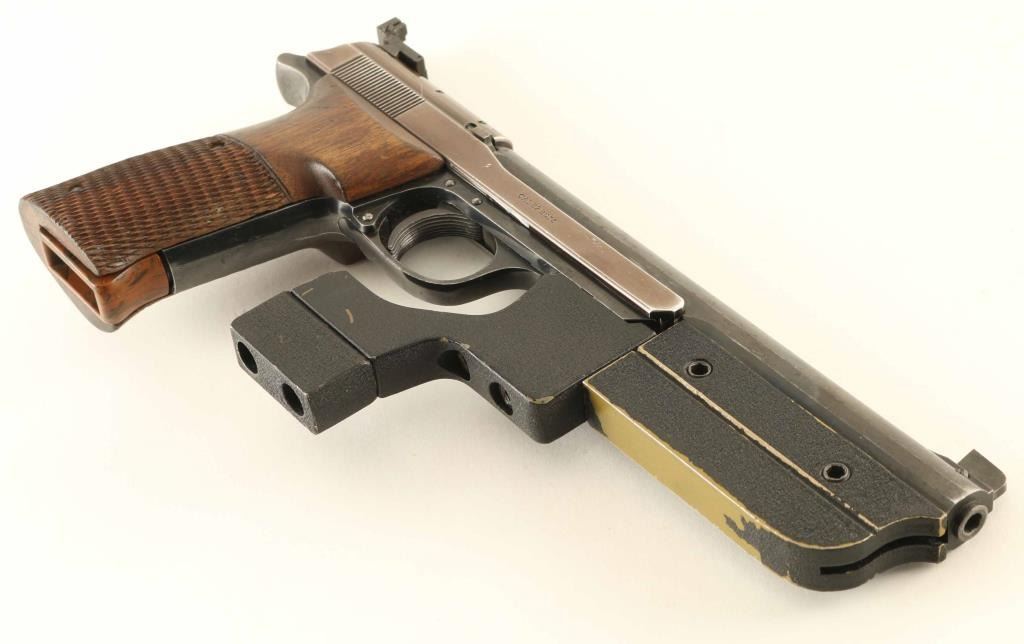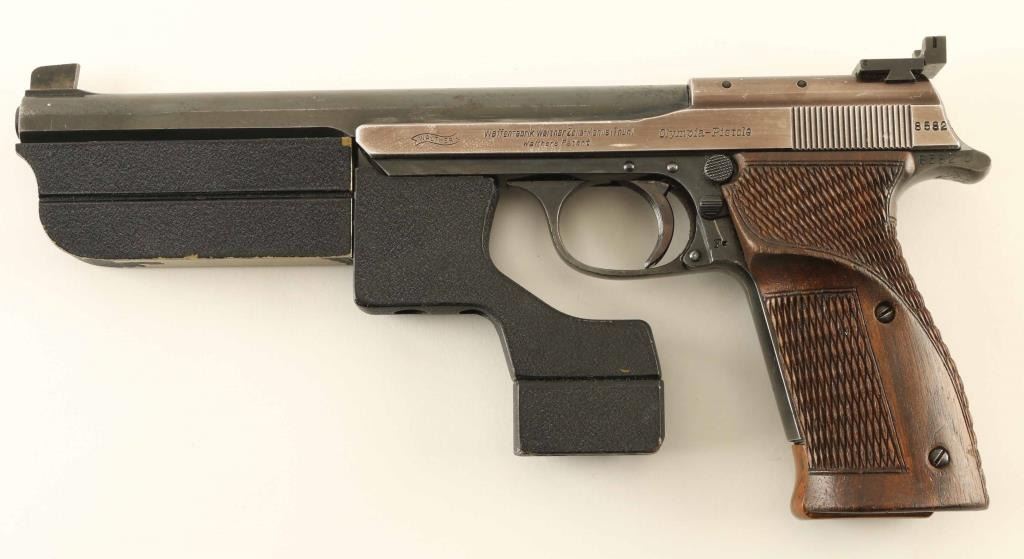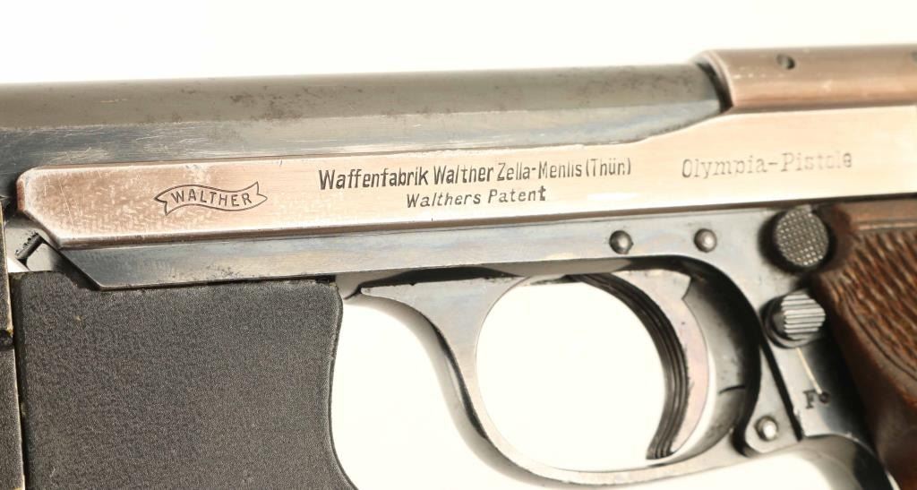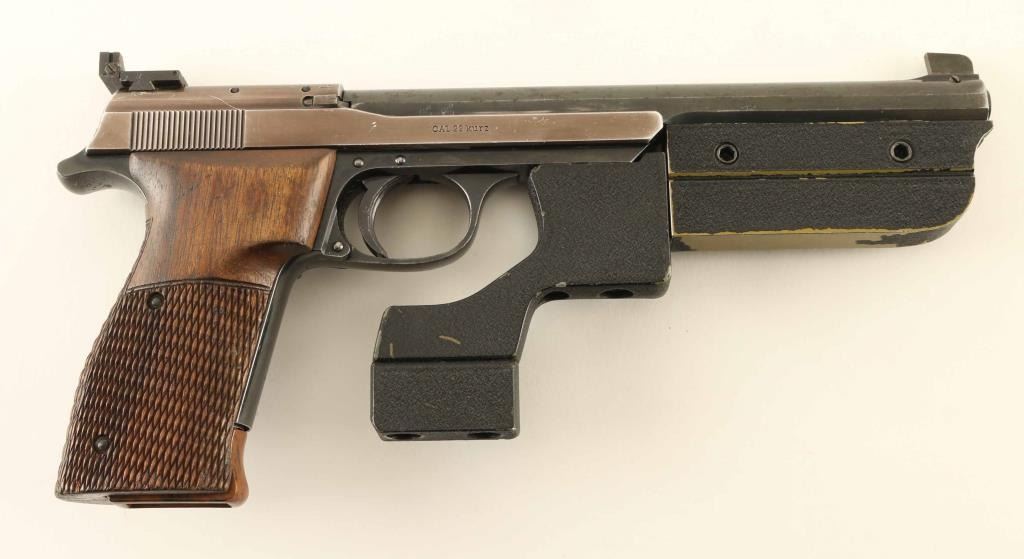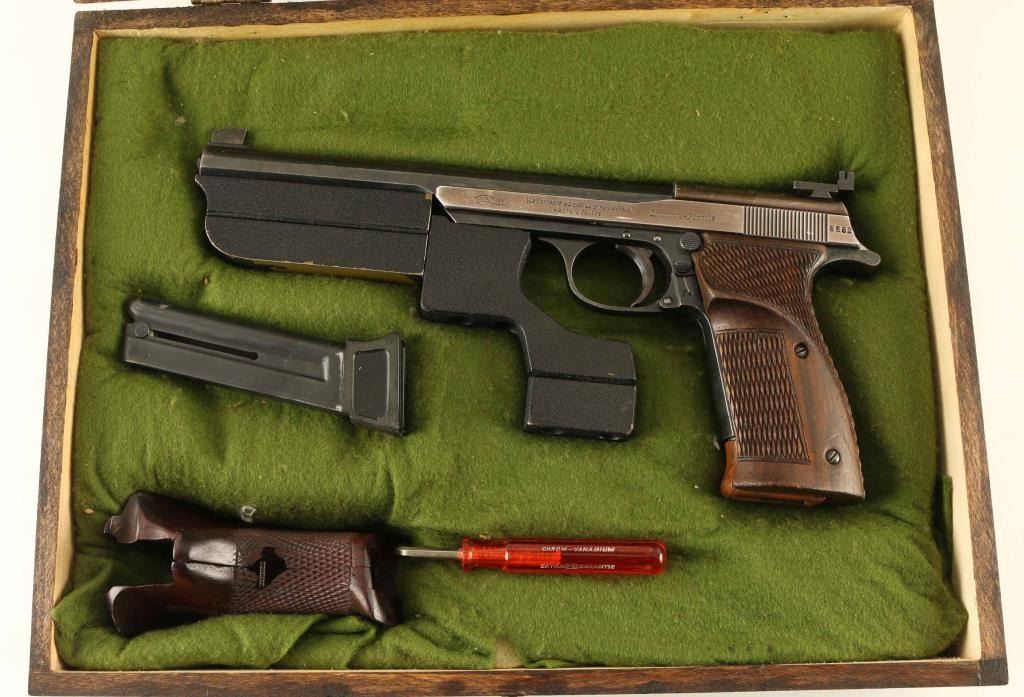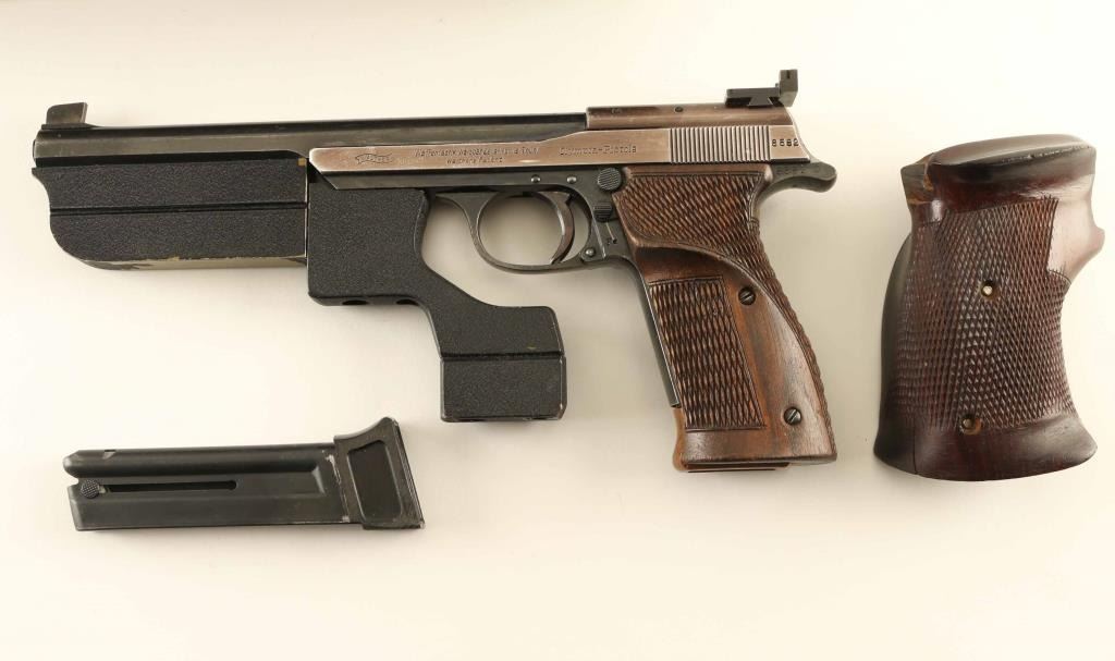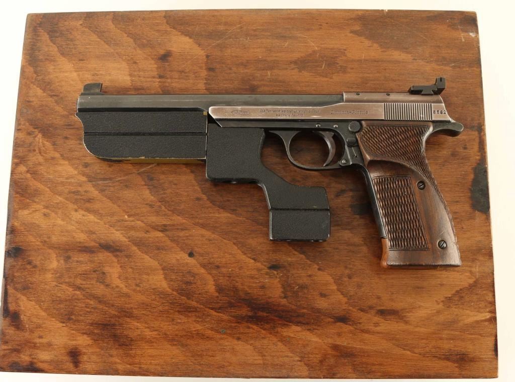 German semiautomatic target pistol features 7.5" barrel, tall partridge front sight, adjustable rear sight, manual safety on frame, oversize checkered wood grips, barrel & frame weights. Bore is very good. Metal surfaces retain 70% blued finish, thinner and grayish colored on slide,with bare metal on all edges and corners of slide, fine scratches on barrel and front strap. Grips are very good condition, extend past frame for longer grip. Includes (2) magazines with extended plastic bottoms, tool for weights, additional (larger) wrap-around grip, checkered wood, crcked on front edges and missing some wood. All fitted into a fair condition wood case with green felt lining. Condition is NRA Very Good *** C&R Firearm ***