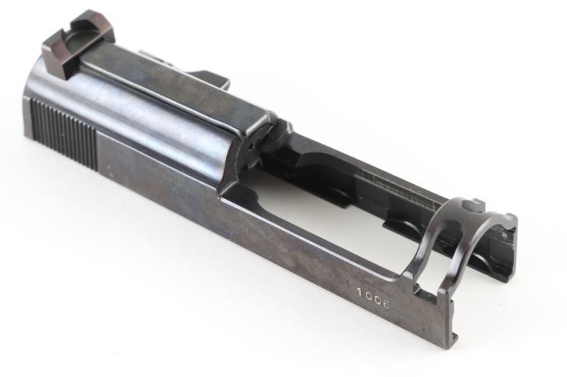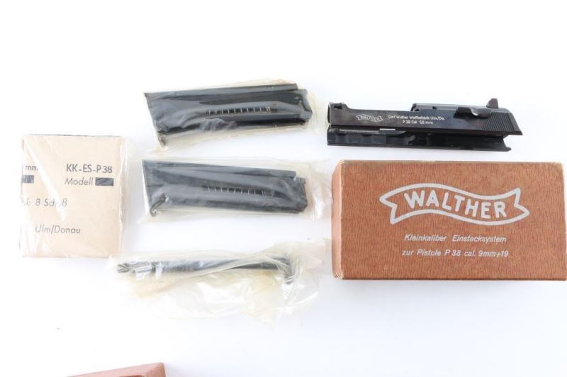 Vintage Walther Conversion kit in the original factory box. High polish blued slide id marked with Walther banner followed by "Carl Walther Waffenfabrik Ulm/Do. P38 Cal 5,6 mm" in two lines. Serial number "1006" with Nitro proof. Barrel sleeve with matching serial number, and nitro proof. Two magazines stamped with Walther banner. Markings in white. Factory test target in box. All are in excellent condition. Just about NIB.